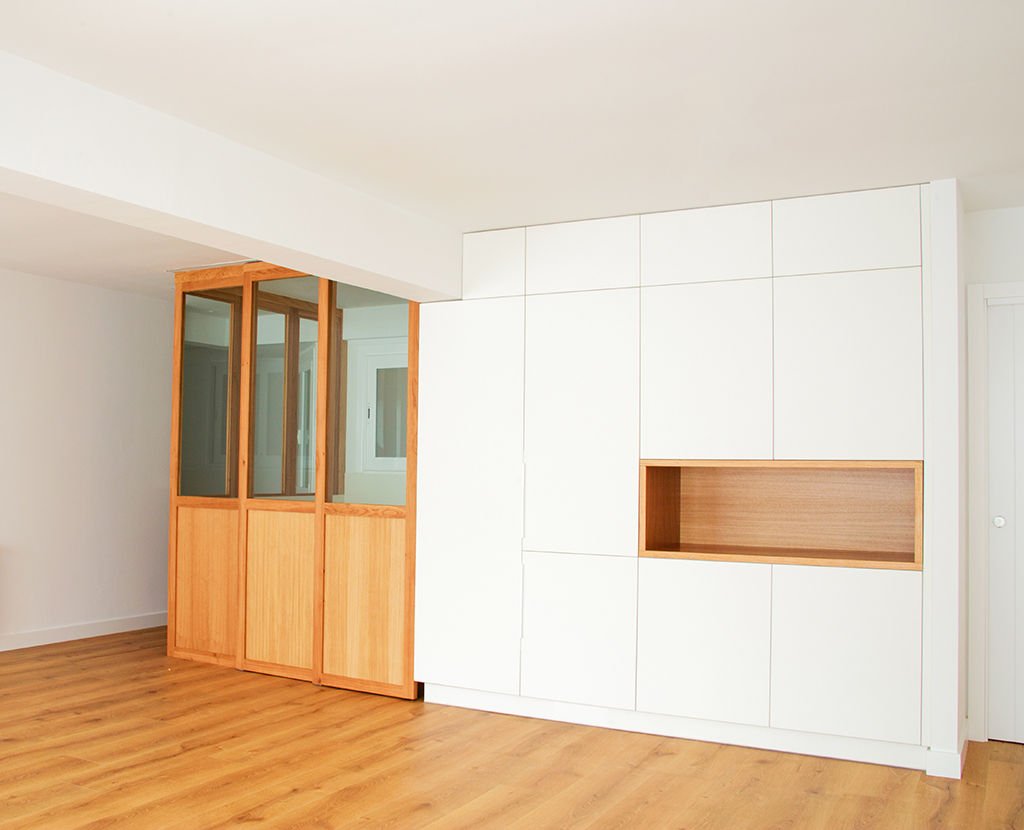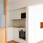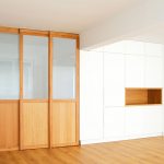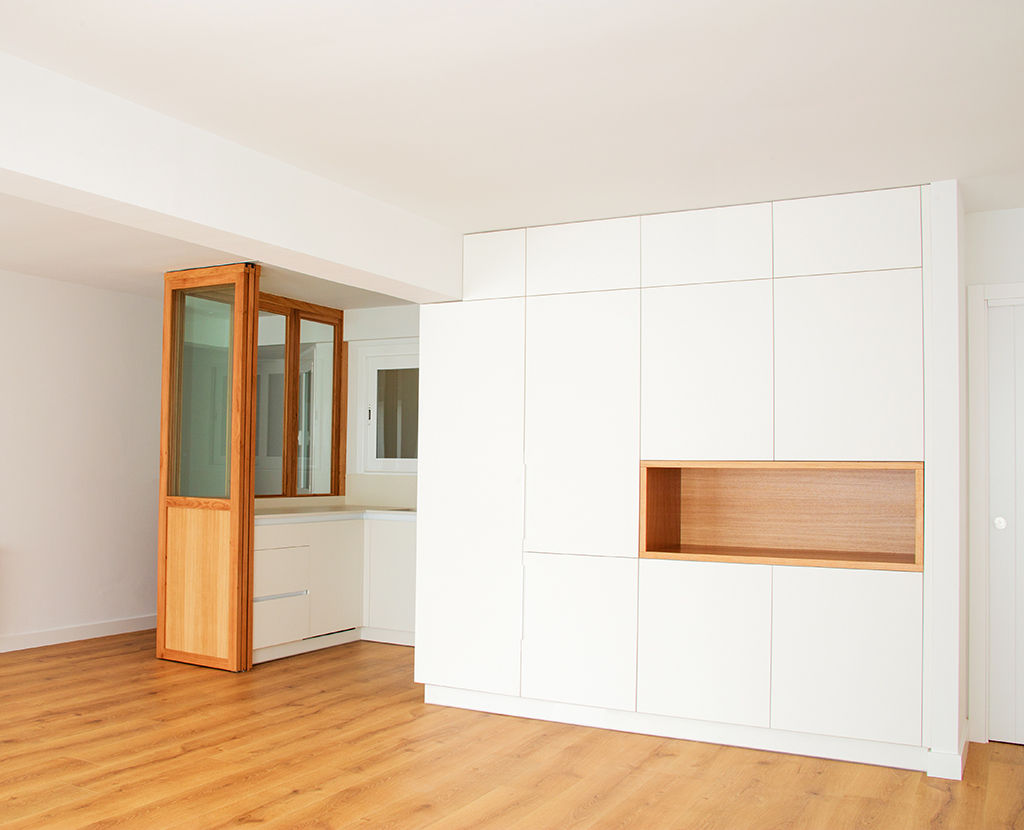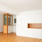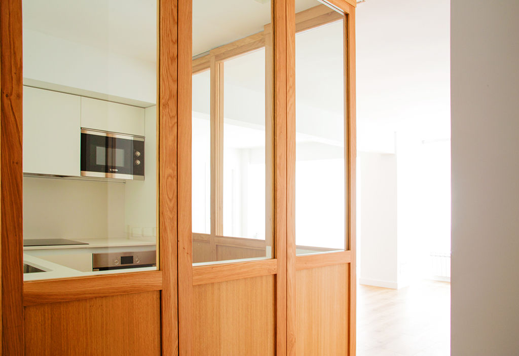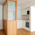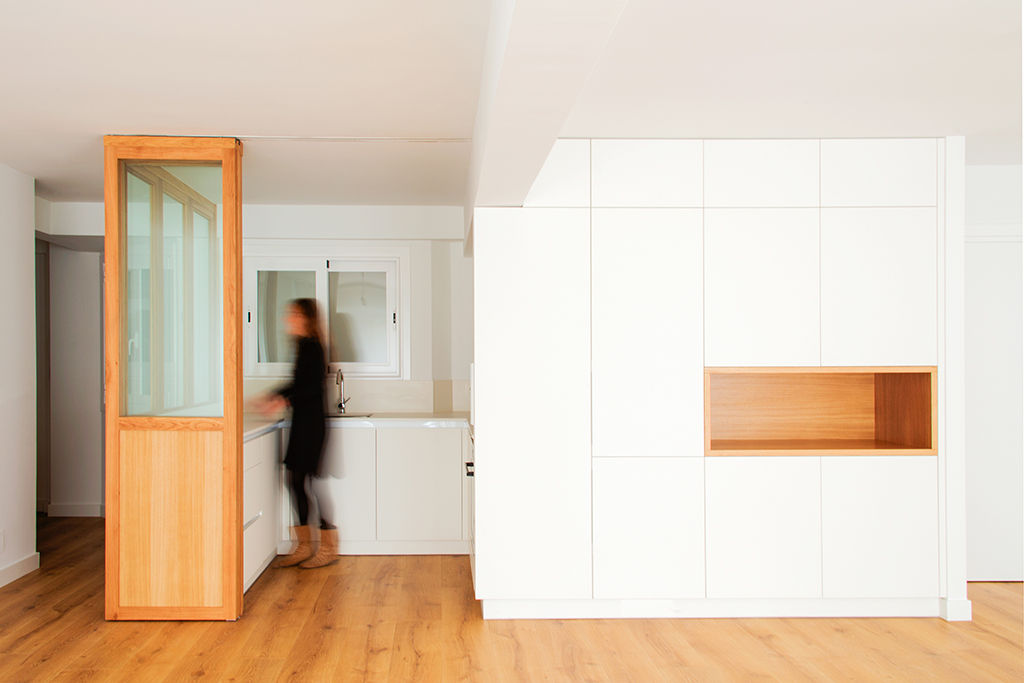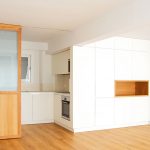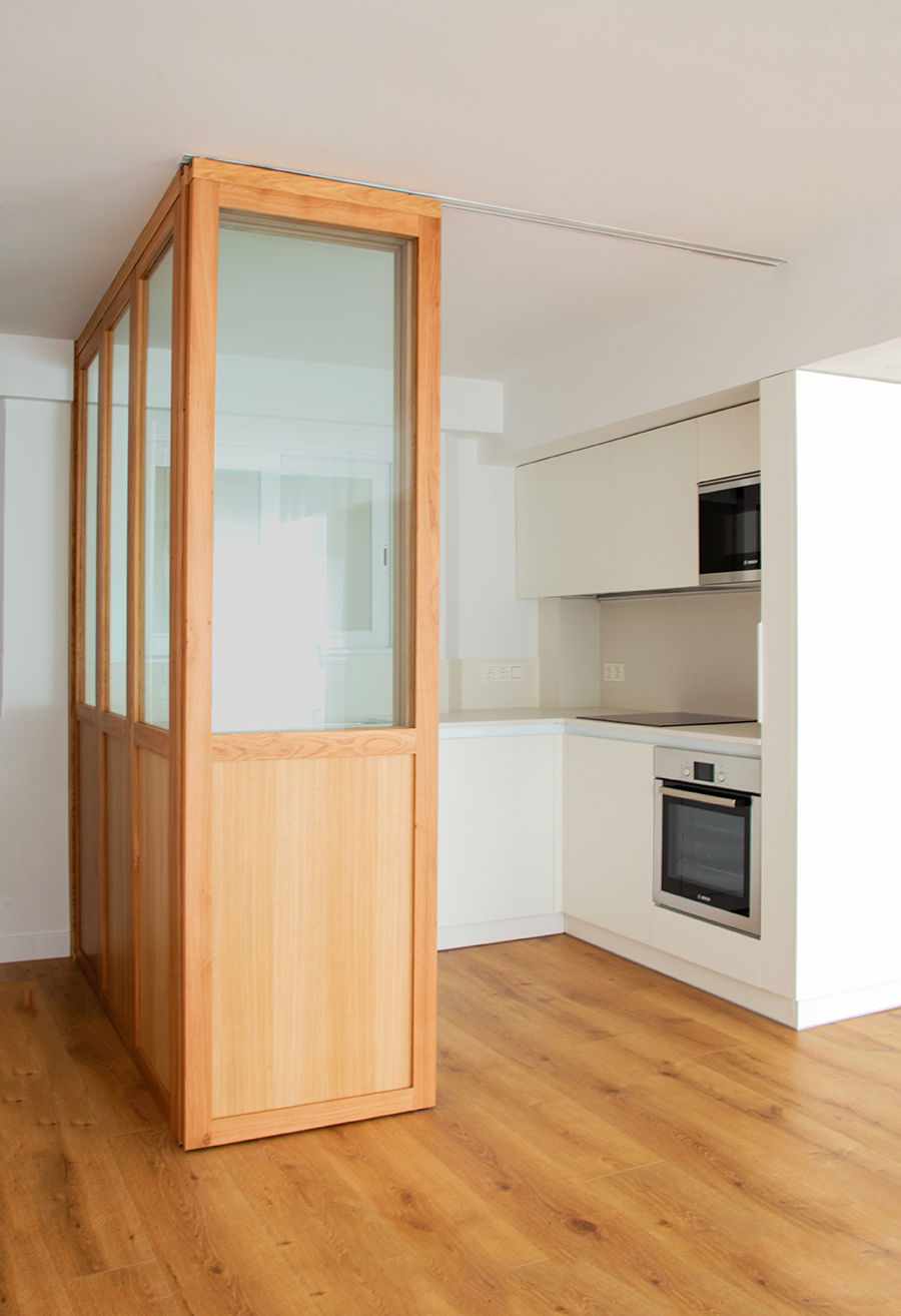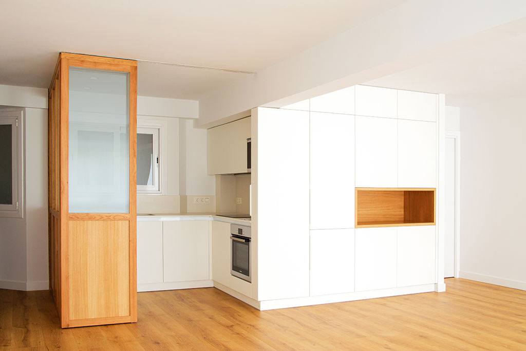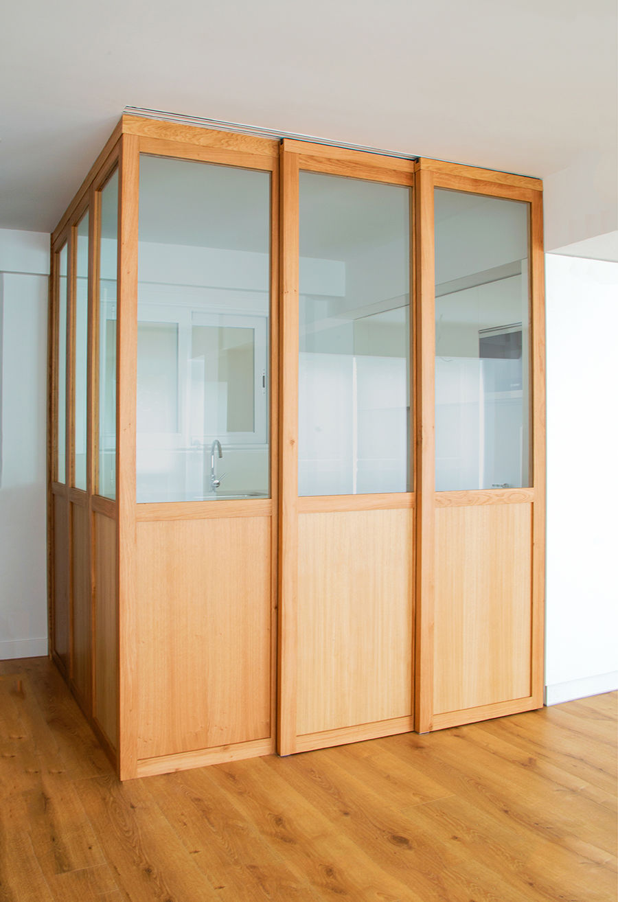 Propusimos reducir la cocina para maximizar el espacio de estar. La cocina se convierte en un cubículo de 4.5m² que invade la zona de estar ocultando en un armario alto la despensa y el frigorífico. Un cierre móvil acristalado de madera de roble permite independizar los 2 ambientes.