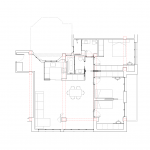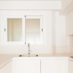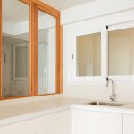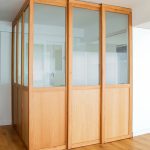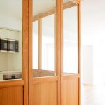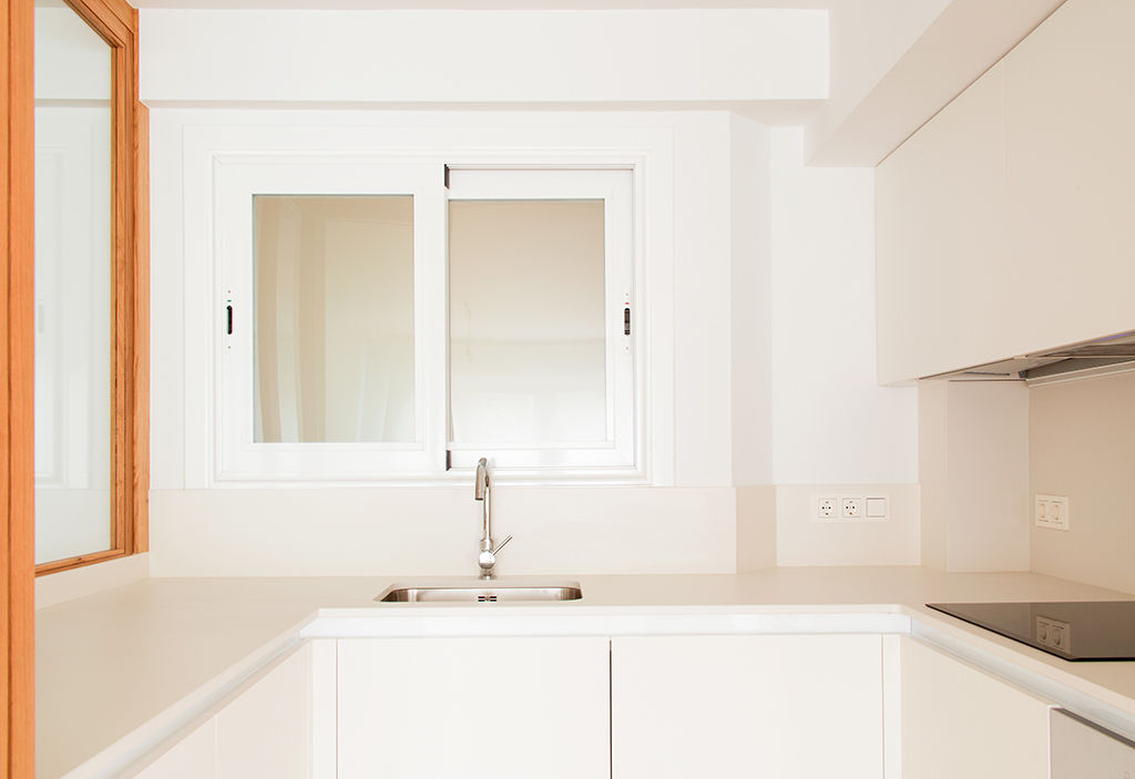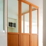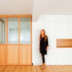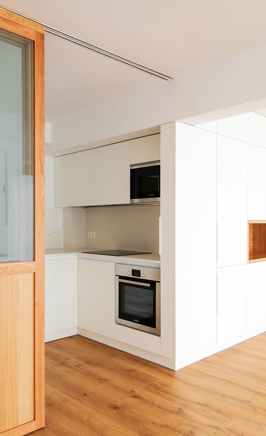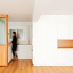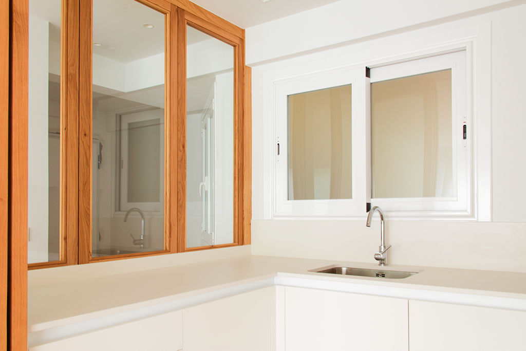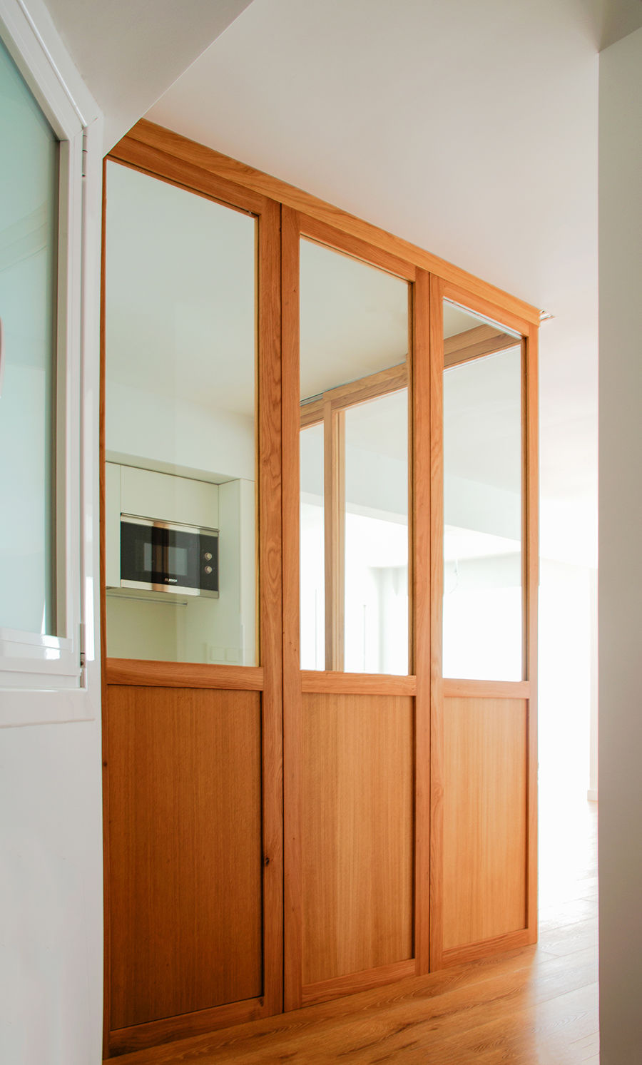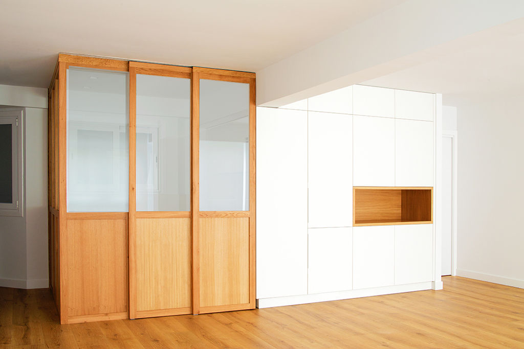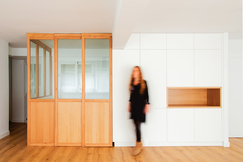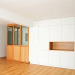 Propusimos reducir la cocina para maximizar el espacio de estar. La cocina se convierte en un cubículo de 4.5m² que invade la zona de estar ocultando en un armario alto la despensa y el frigorífico. Un cierre móvil acristalado de madera de roble permite independizar los 2 ambientes.