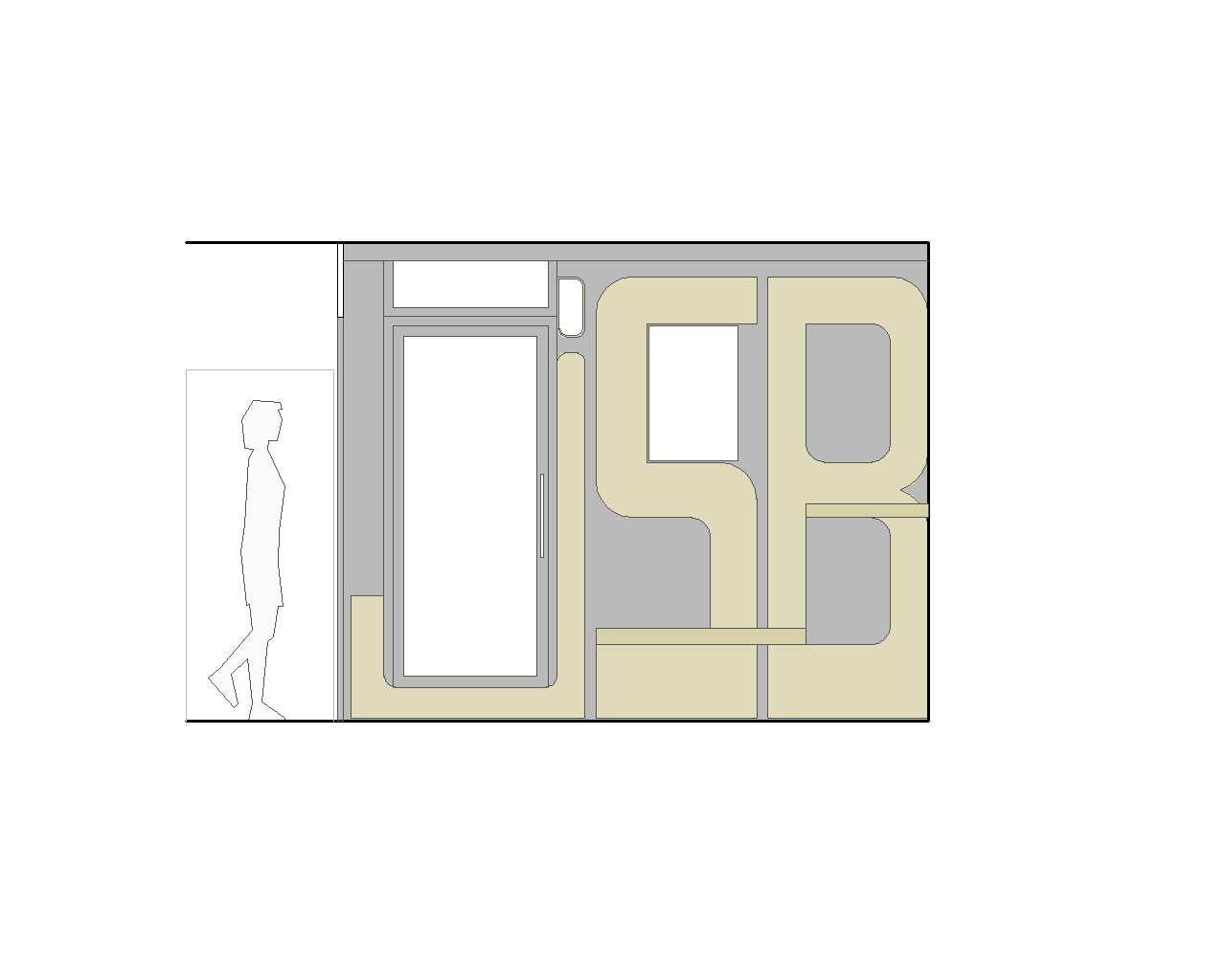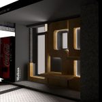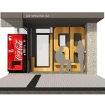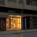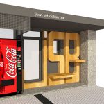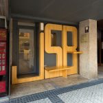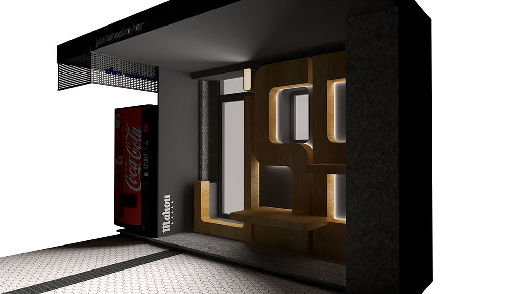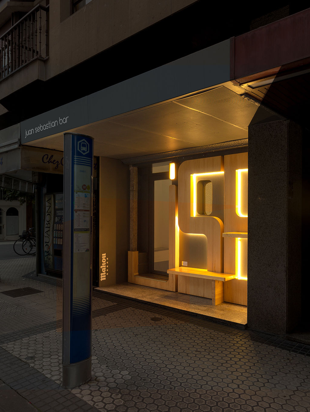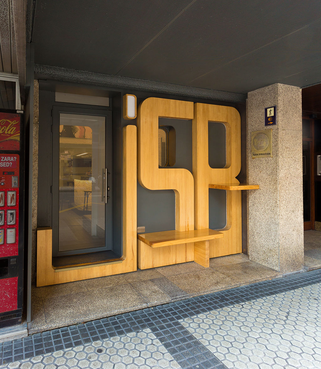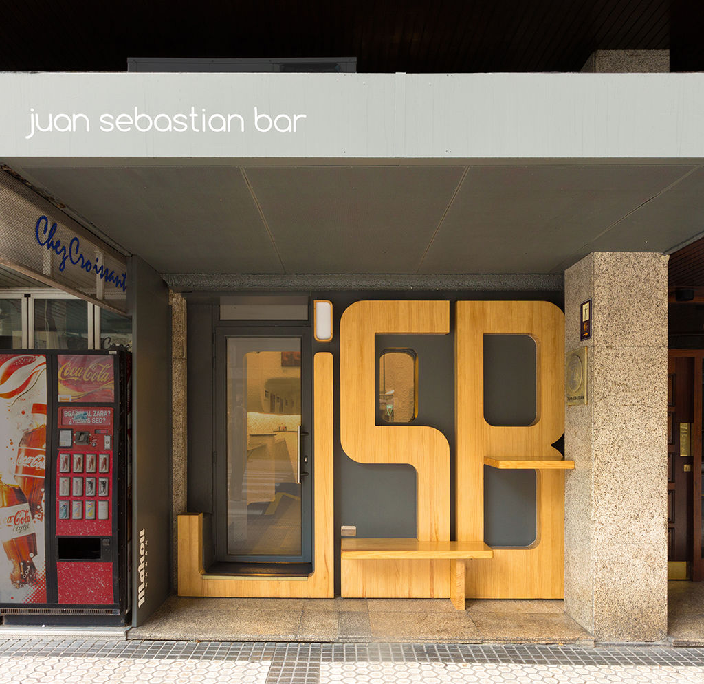 Unas grandes letras de madera de pino con las siglas del bar cubren la nueva fachada, haciendo un guiño al diseño original. Las letras incorporan un banco y una balda desmontables que se retiran al cerrar.