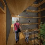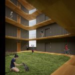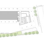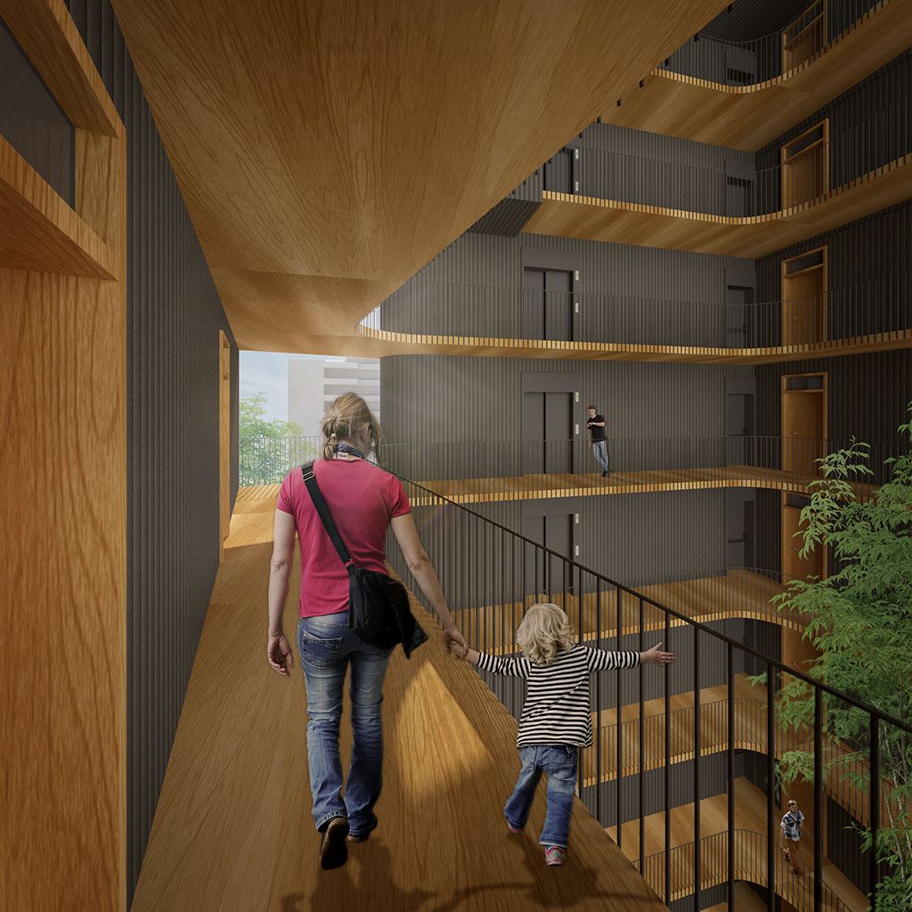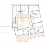 Para no superar la edificabilidad establecida el edificio cuenta con un patio central en torno al cual se organizan las 60 viviendas a las que se accede a través de unas galerías abiertas. Las comunicaciones se resuelven con un único núcleo de comunicaciones con 2 ascensores y una escalera protegida. Este patio, vertebrador de las circulaciones, está abierto al sur para maximizar su soleamiento y ofrecer vistas al exterior y potenciar el diálogo dentro-fuera. El patio será ajardinado en la planta primera de viviendas ofreciendo a los habitantes un agradable espacio comunitario de encuentro.