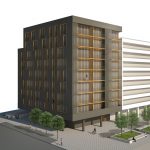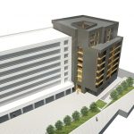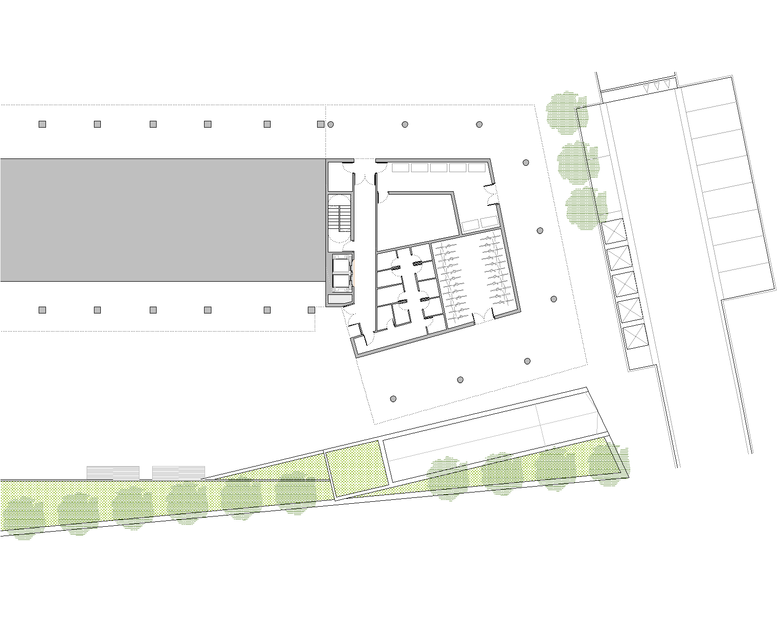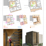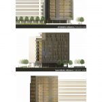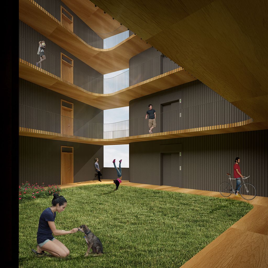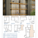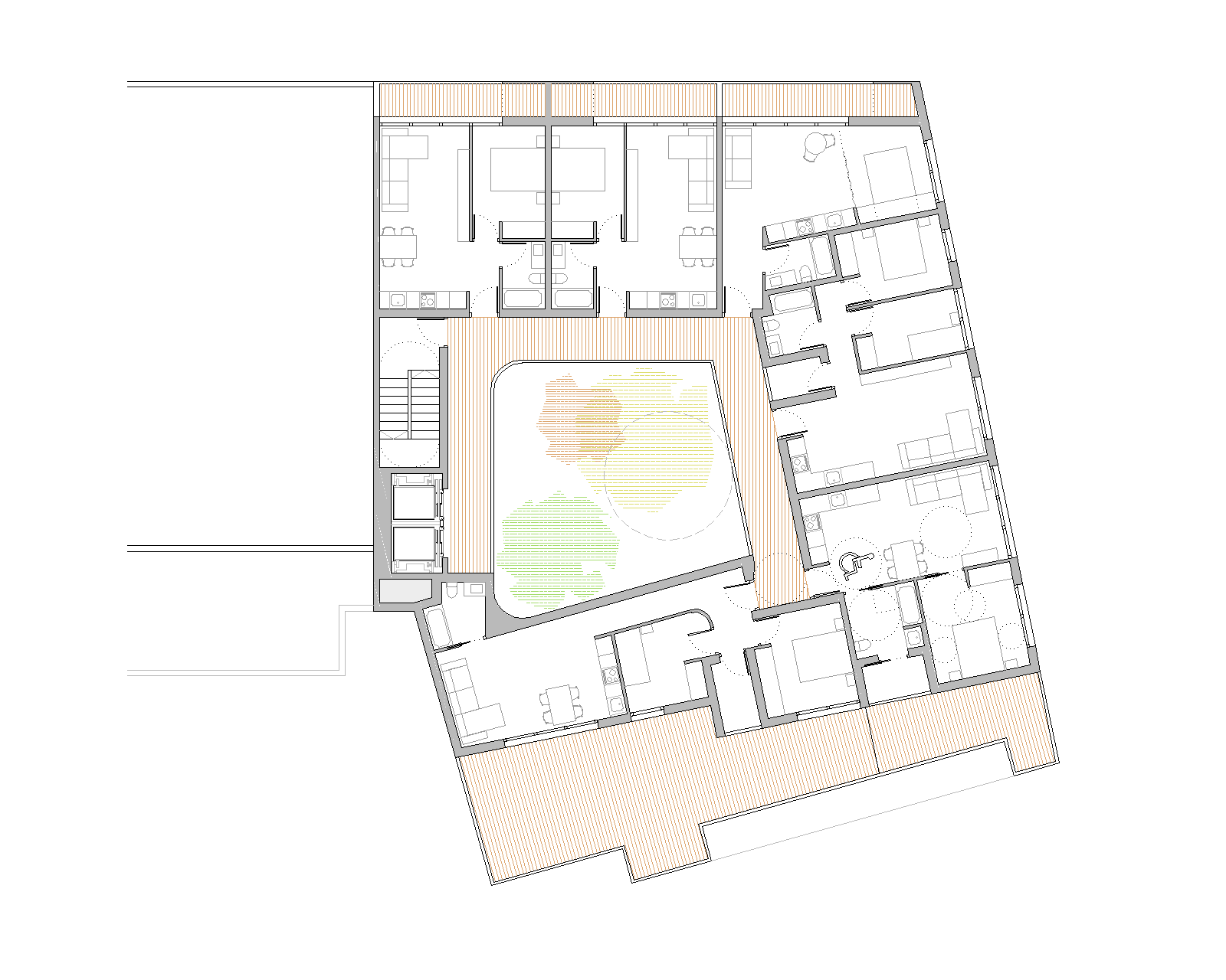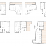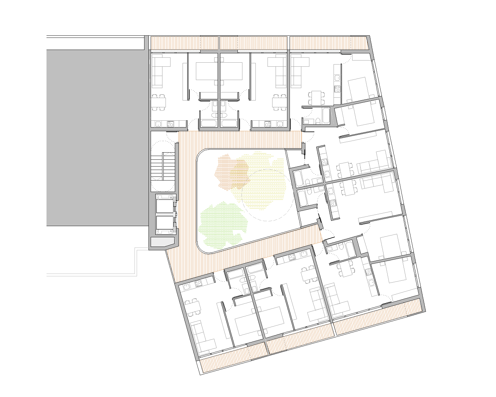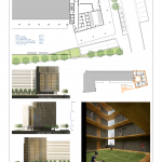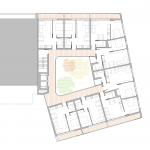 El núcleo de comunicaciones se coloca en la medianera dejando para las viviendas las 3 fachadas libres del volumen (norte, este y oeste). Las viviendas se colocan en U alrededor del patio con todos los salones y dormitorios abiertos al exterior y a las vistas.