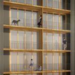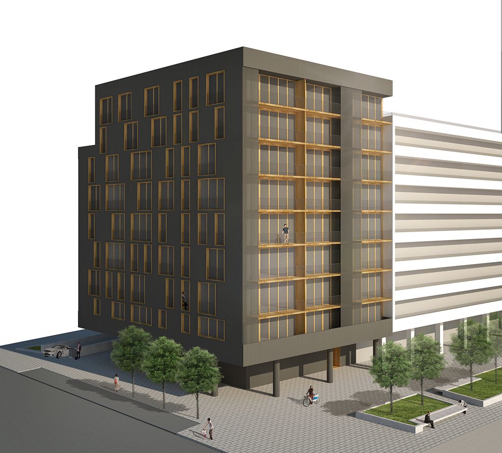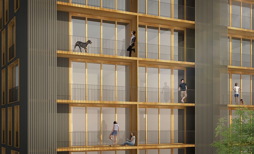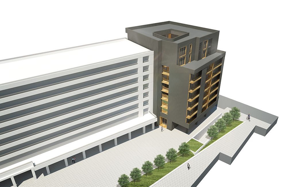 Con el objetivo de maximizar el número de viviendas, la edificación vuela 1.25m perimetralmente aprovechando el vuelo máximo permitido por las normas urbanísticas del Plan Especial del área 10-2-OR Salberdin. Este mecanismo aumenta el perímetro de fachada y permite disponer las 60 viviendas solicitadas en las bases.