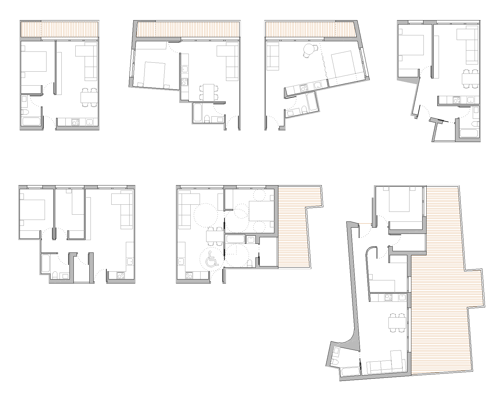 Las viviendas orientadas este-oeste cuentan con unas terrazas corridas de 1.25m de profundidad en las que se encuentran los tendederos. Las orientadas a norte no cuentan con terraza y tienen sus tendederos abiertos al patio.