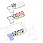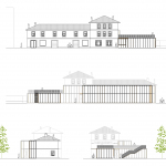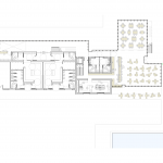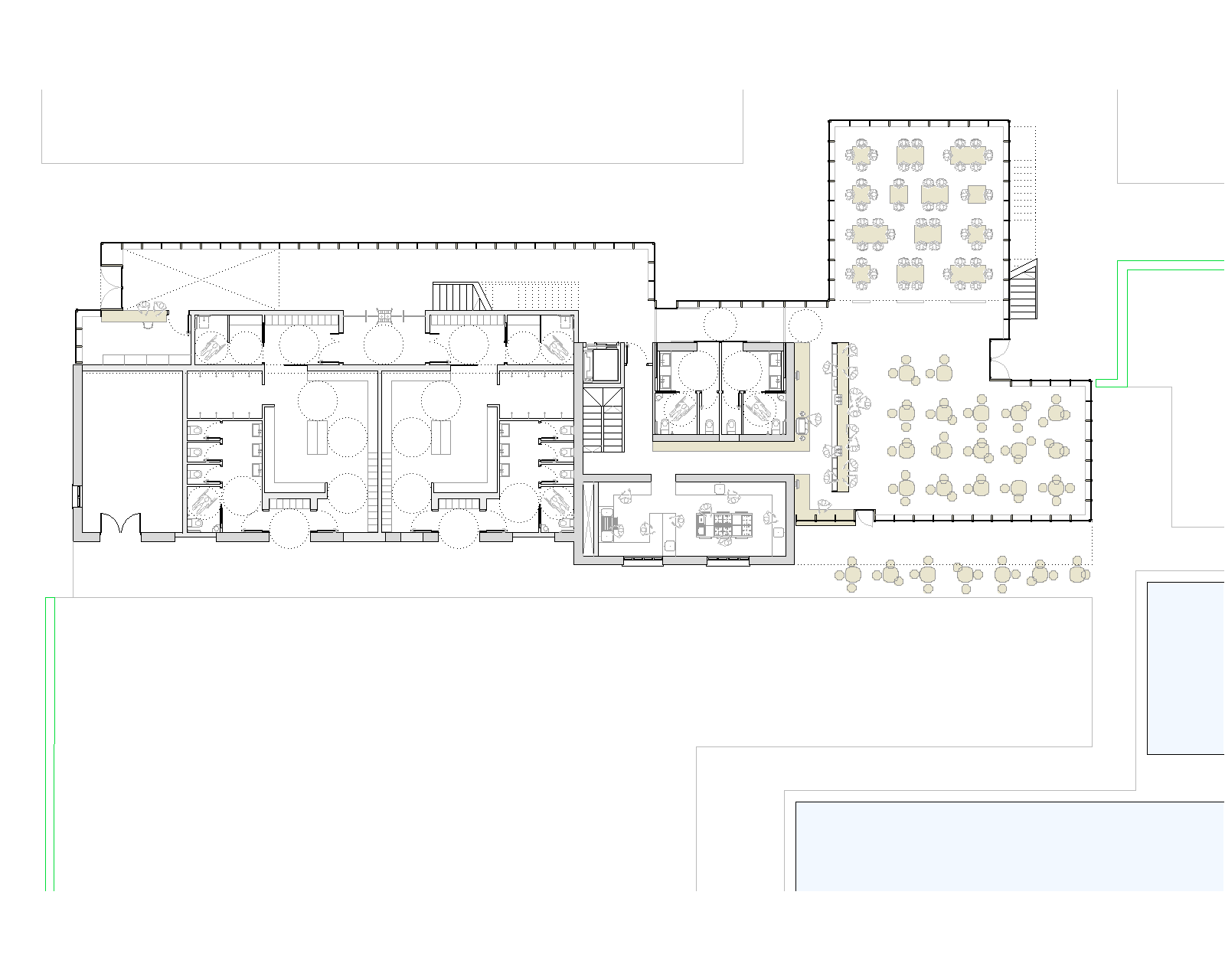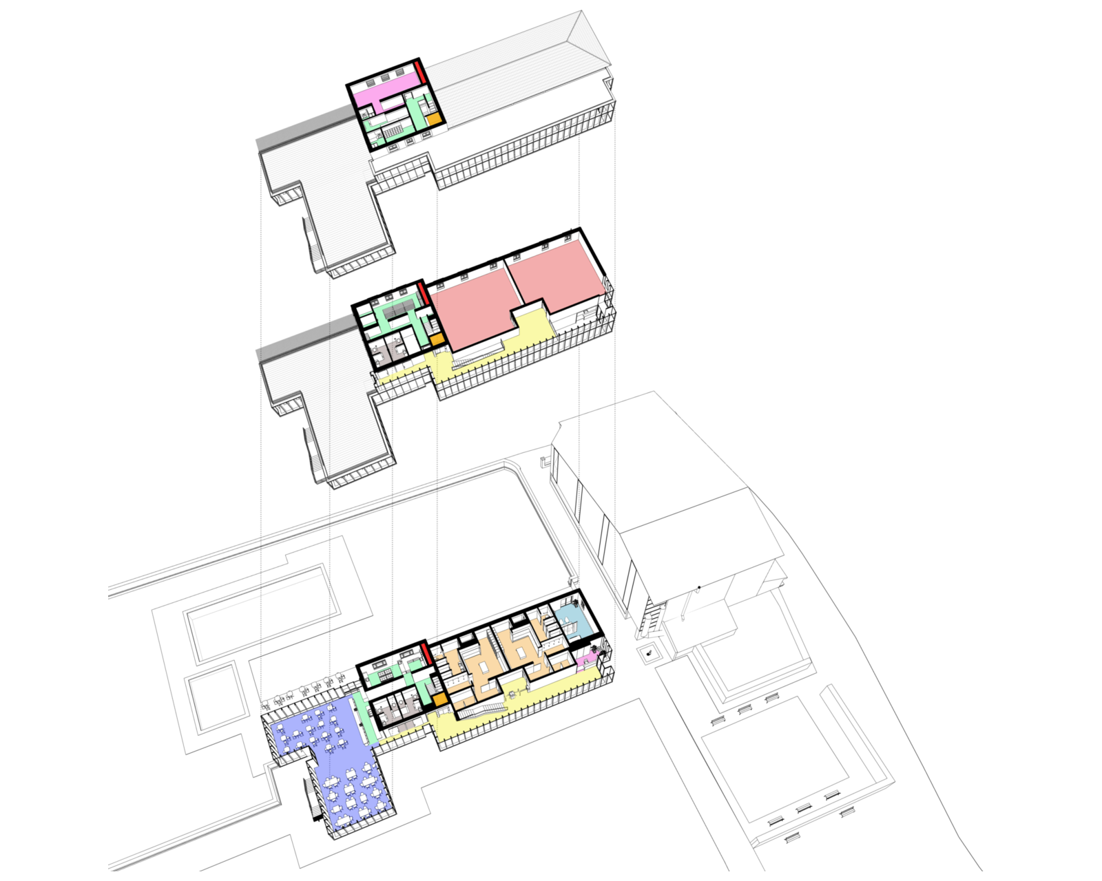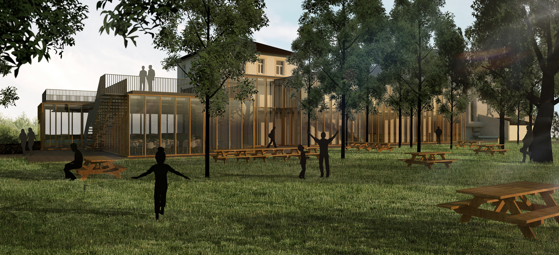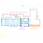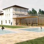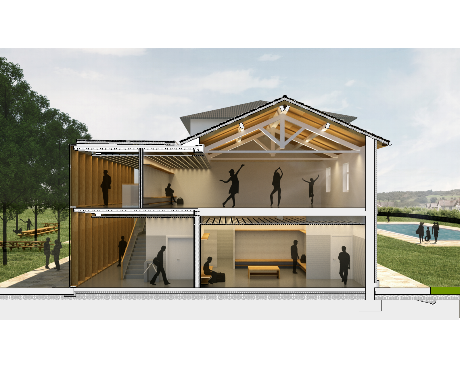 La propuesta es muy conservadora con el edificio actual en su fachada más urbana hacia el ayuntamiento y la carretera, demoliendo únicamente el ábside existente en planta baja para poder situar estratégicamente la pieza bar-restaurante como remate del edificio abierta al parque y a las piscinas simultáneamente.