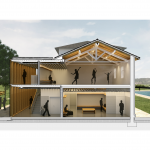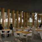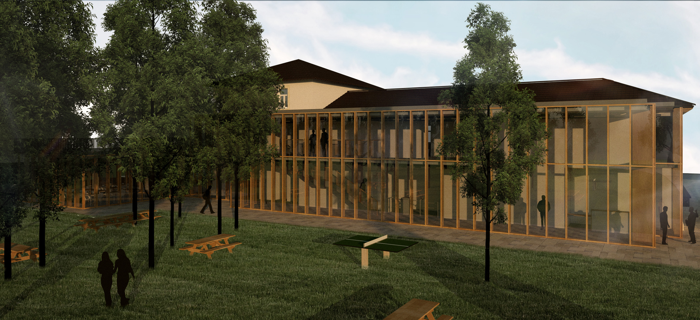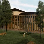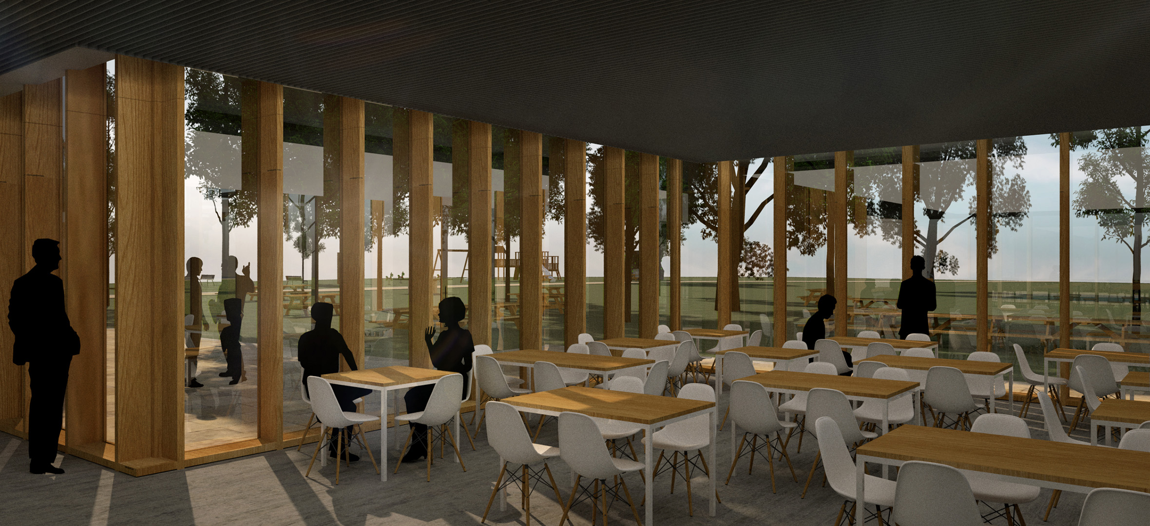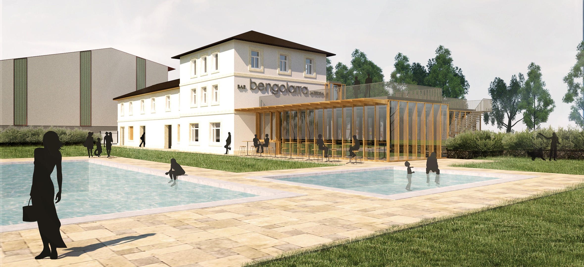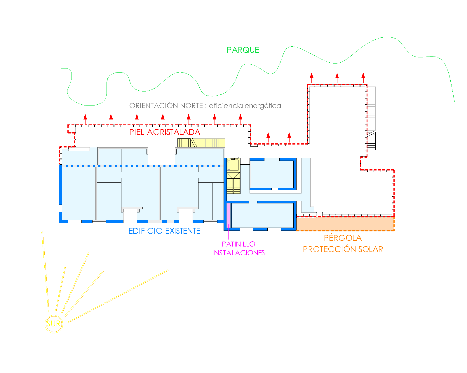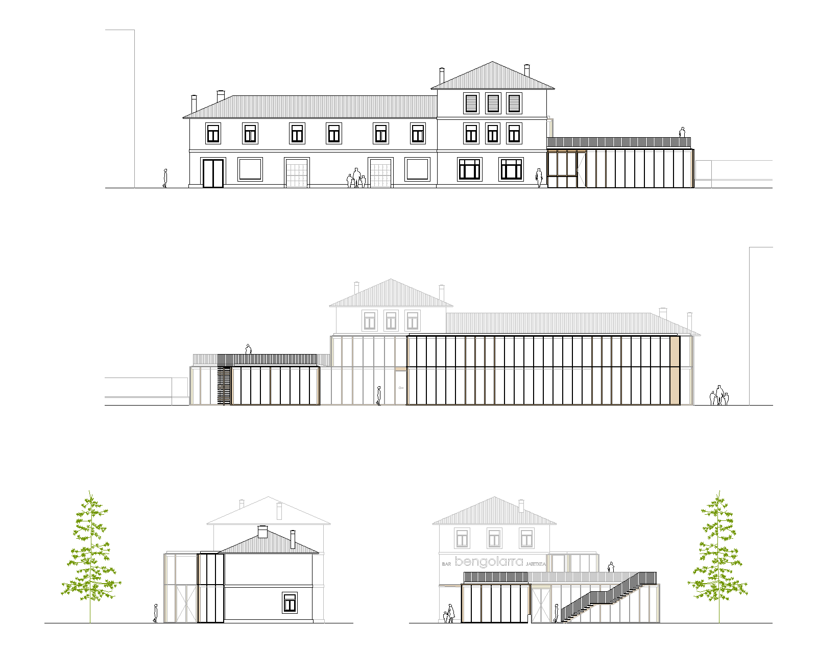 No hay duda de que el privilegiado emplazamiento del edificio Bengolarra invita a abrirse al formidable parque en el que está situado y a potenciar la relación del usuario con la naturaleza más próxima y cercana. Es por ello que nuestra propuesta conserva la fachada actual a las piscinas y amplía el edificio en su fachada norte con una piel acristalada de muro cortina de madera que dialoga con los troncos verticales de los árboles existentes.