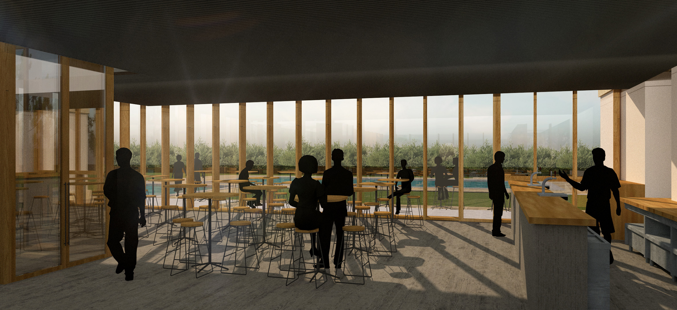 El establecimiento hostelero cuenta con un doble acceso, uno desde el edificio deportivo y otro acceso más principal desde el parque que permite que pueda funcionar independientemente con el resto del edificio cerrado. La cubierta de este elemento es una terraza donde se podrán realizar todo tipo de eventos.