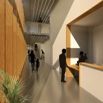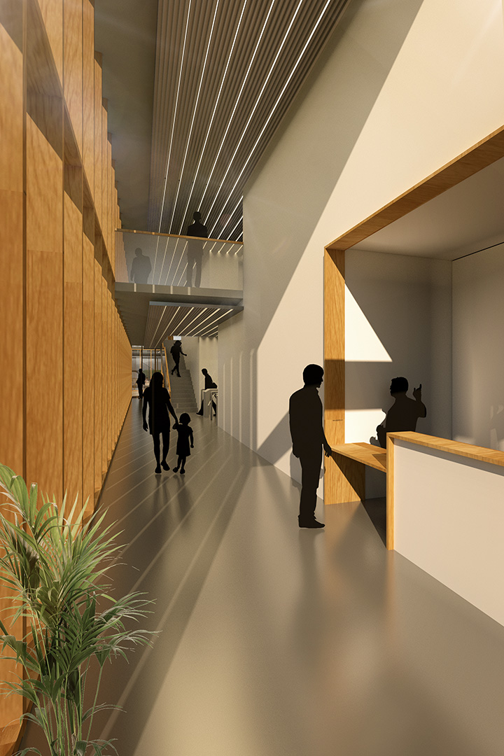 Todas las circulaciones del edificio se desarrollan en la pieza acristalada potenciando la presencia del parque en el edificio.