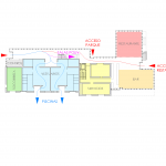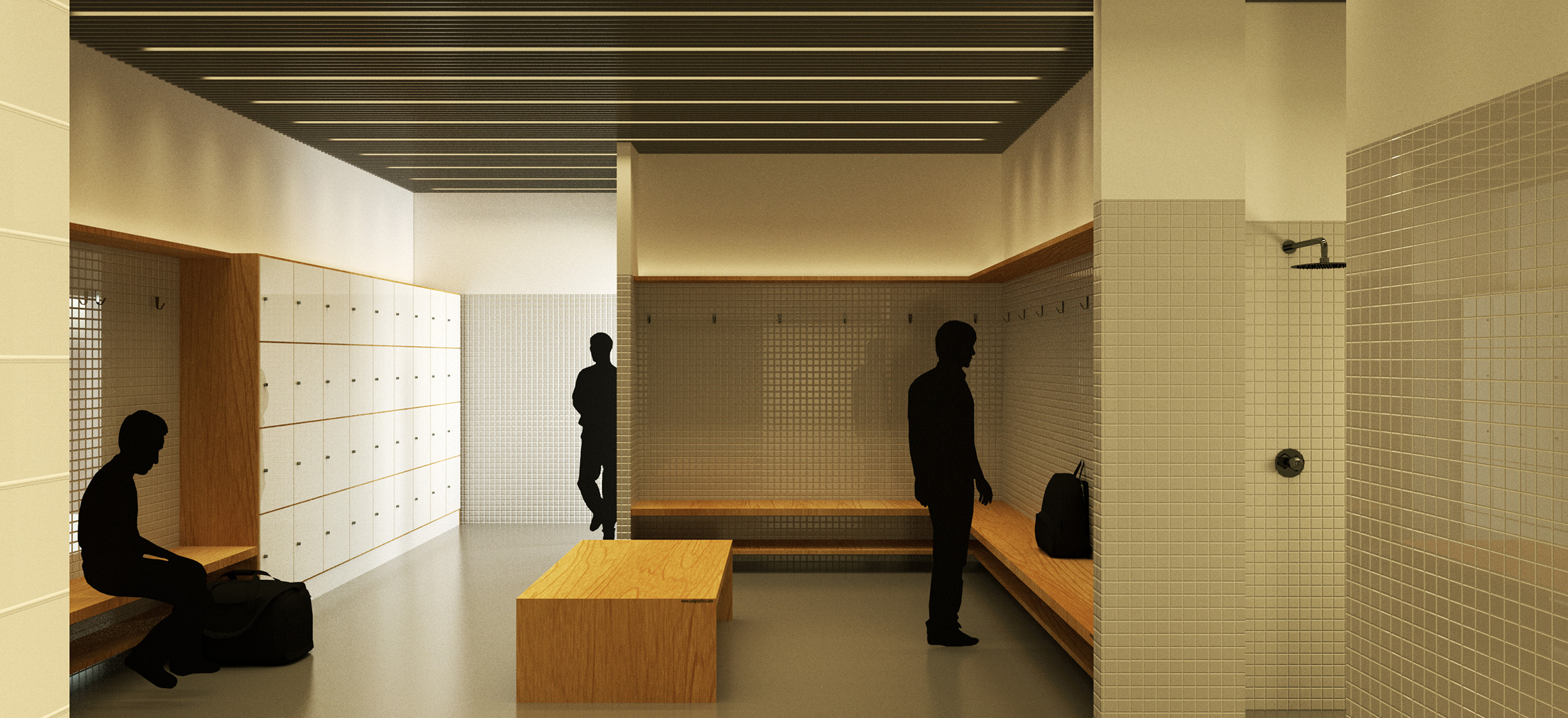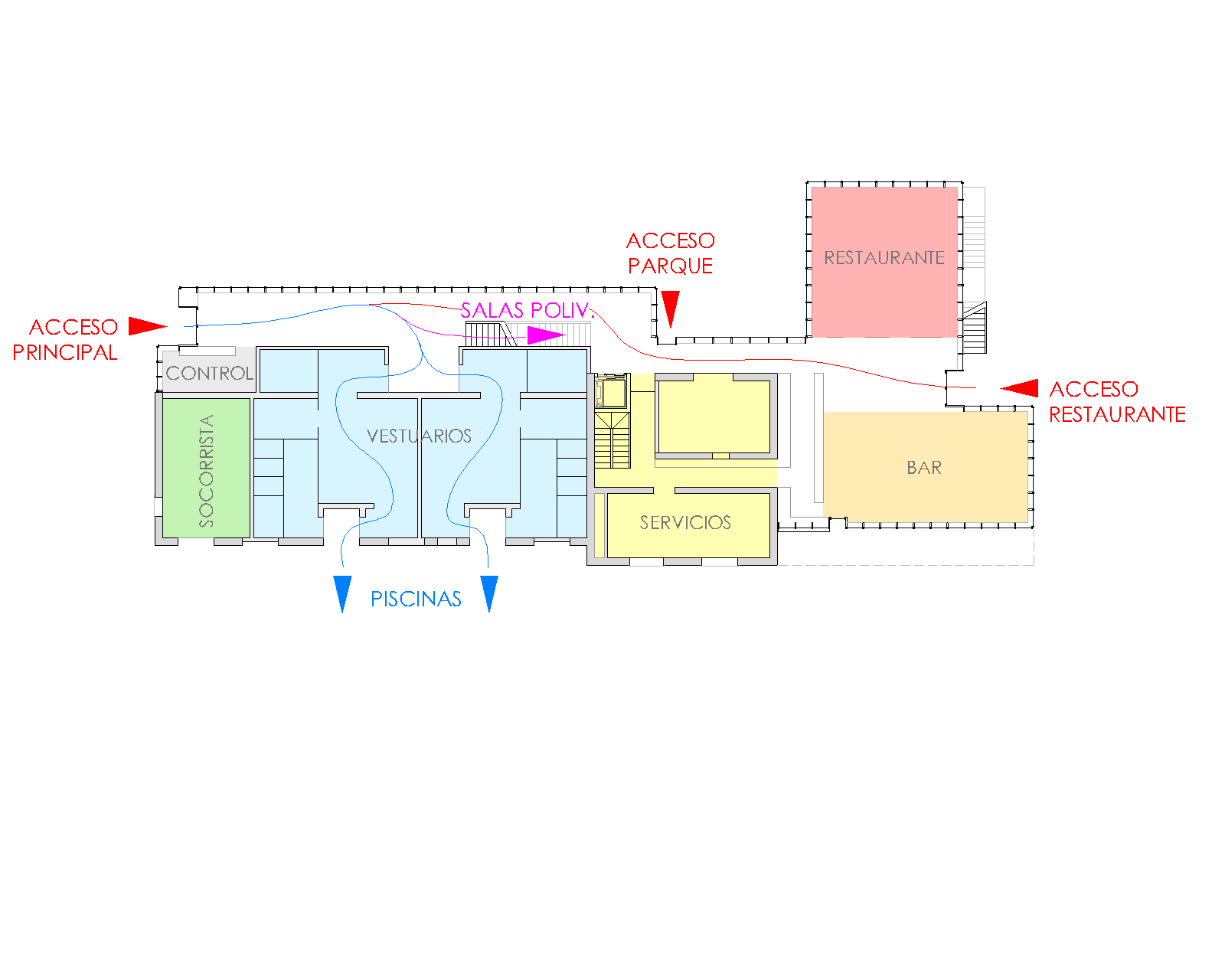 El acceso principal al edificio se sitúa en el lateral junto al frontón, facilitando el uso de los vestuarios por los usuarios del mismo. Piscinas, frontón y las 2 salas polivalentes de planta primera comparten los vestuarios situados en planta baja con acceso desde la fachada abierta al parque. Los vestuarios tienen una salida a las piscinas en la fachada sur resolviendo de esta manera las circulaciones “calzado-descalzo” sin cruces.