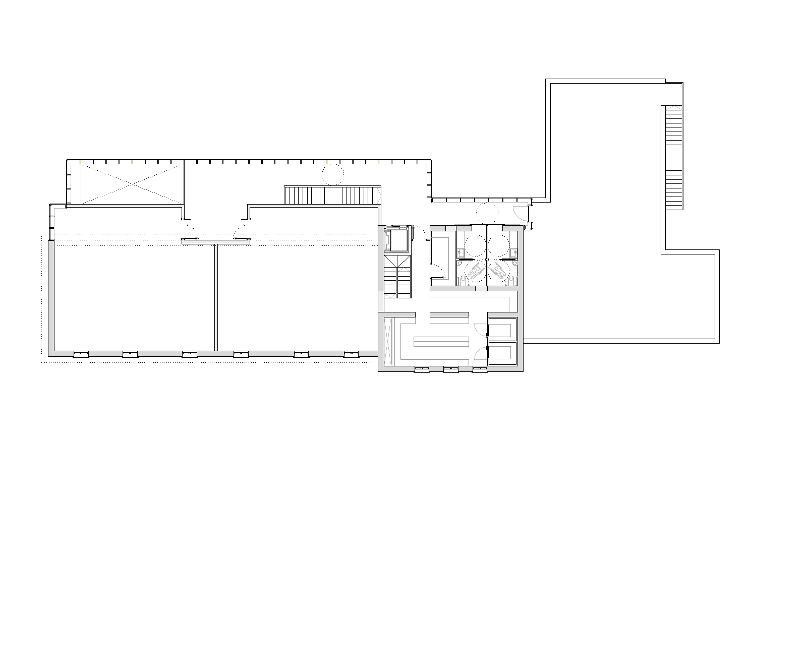 La torre se mantiene intacta y se le da un uso de servicios que encaja perfectamente con su esquema estructural de muros de carga. Este elemento albergará el ascensor, los baños, la sala de instalaciones y los usos auxiliares del restaurante (cocina, almacén y vestuarios).