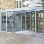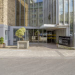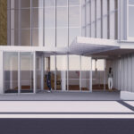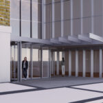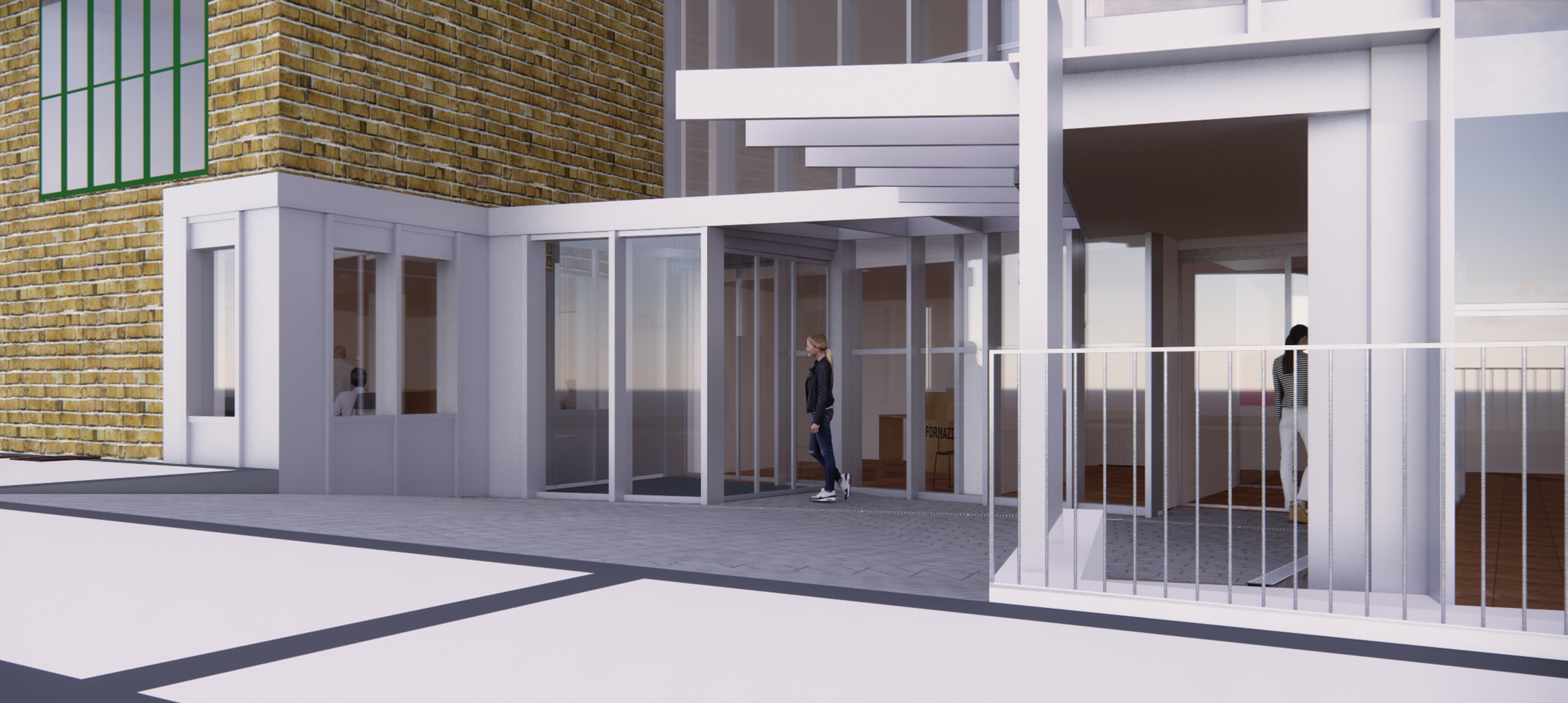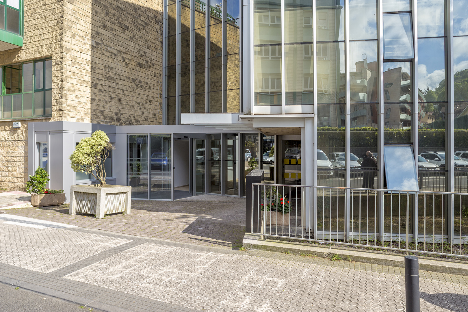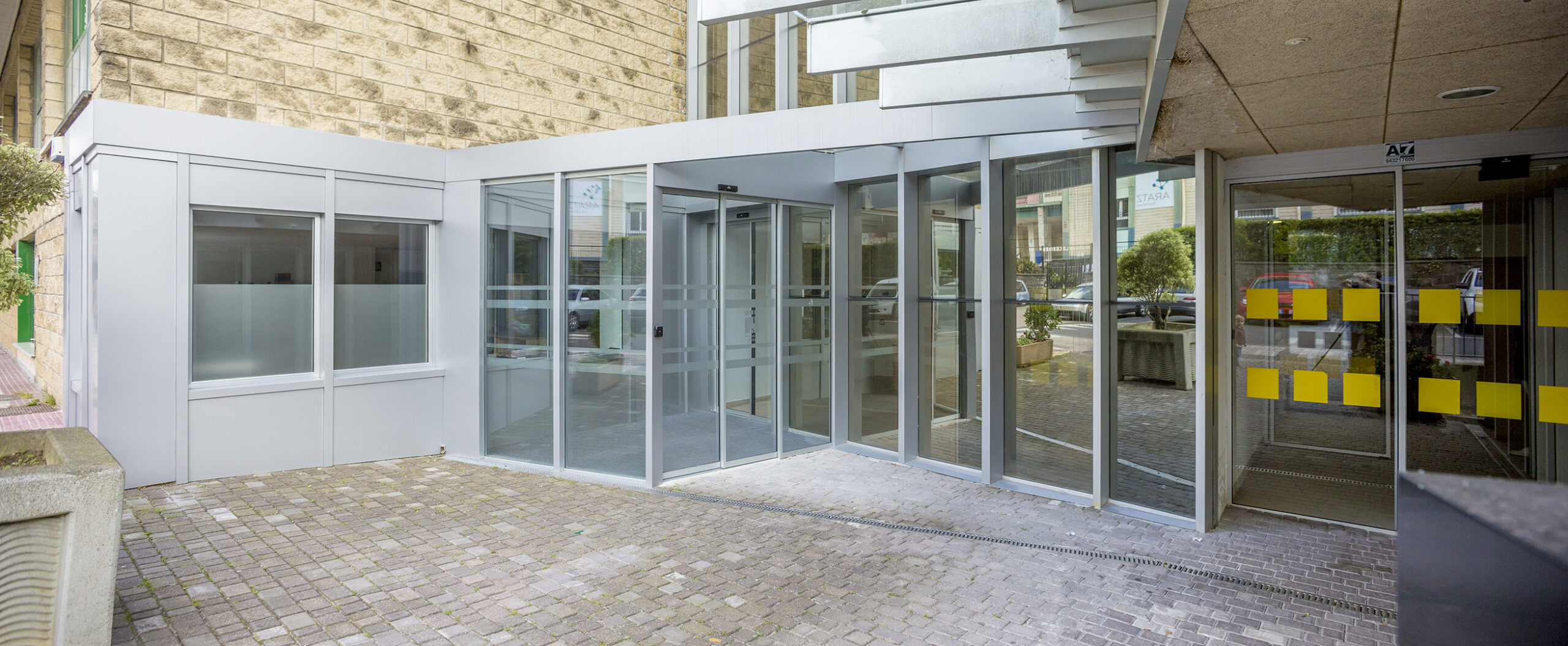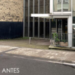 La intervención modifica el muro cortina existente abriendo una nueva puerta y continúa con su mismo lenguaje creando un porche de acceso que abraza al edificio antiguo con una nueva piel que abre huecos en fachada para la nueva zona administrativa.