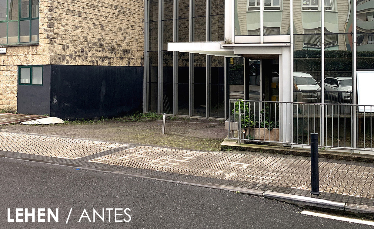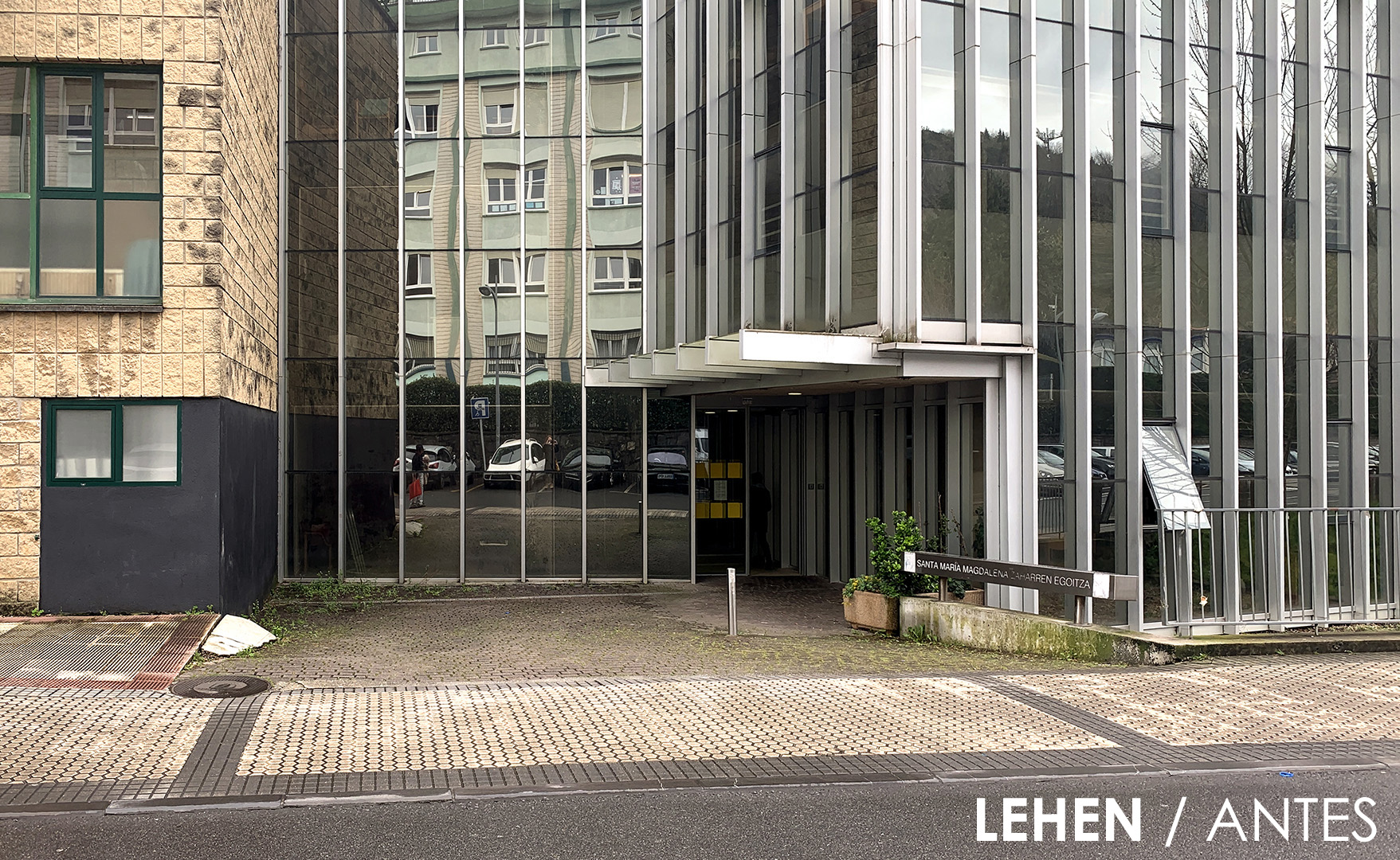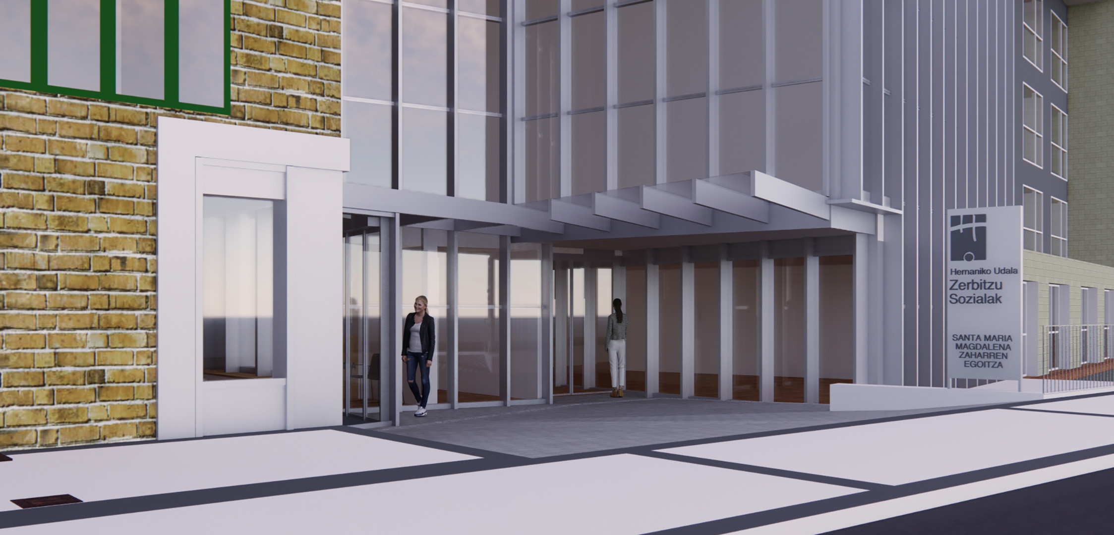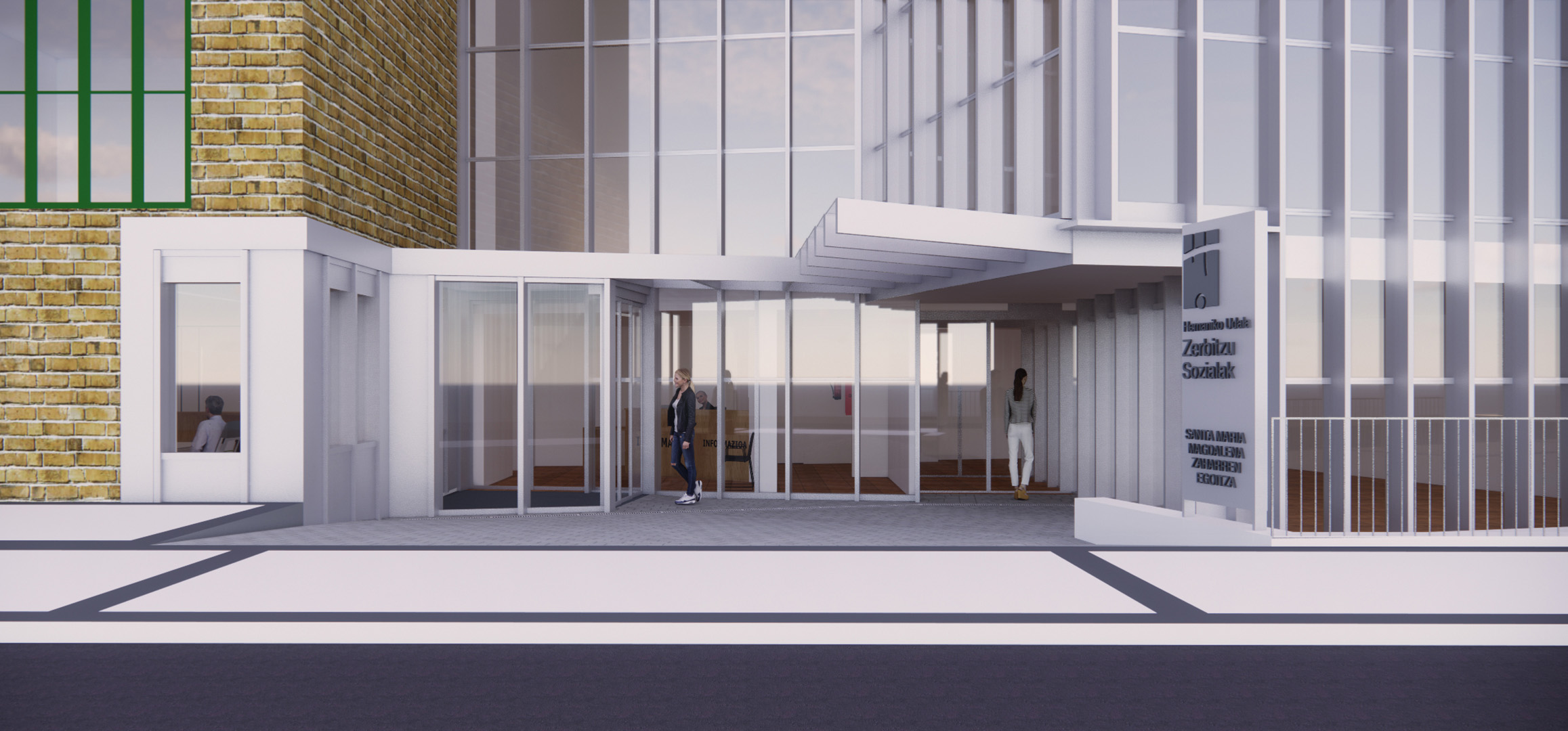 El proyecto crea un nuevo acceso a los Servicios Sociales en la rótula entre el edificio antiguo y su ampliación, recuperando una plaza en mal estado y sin uso.