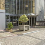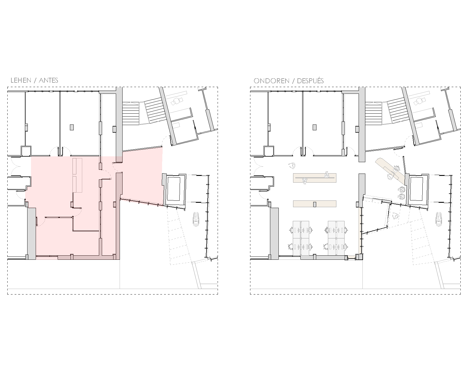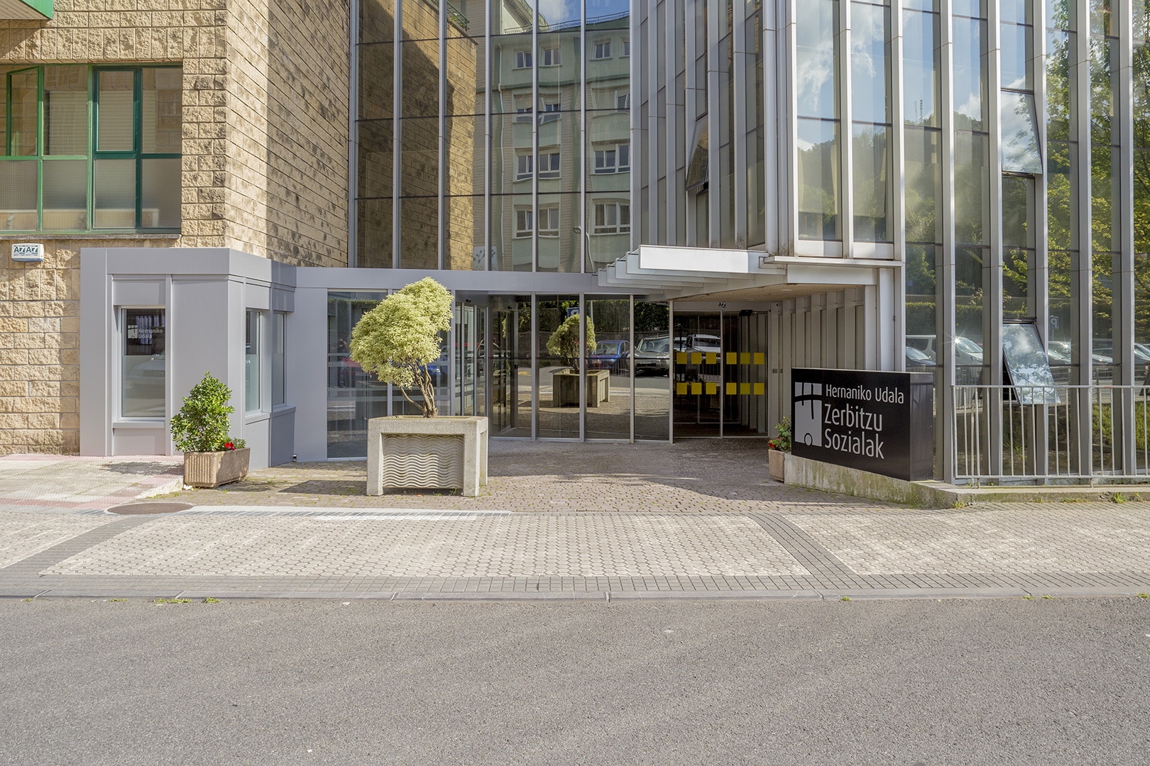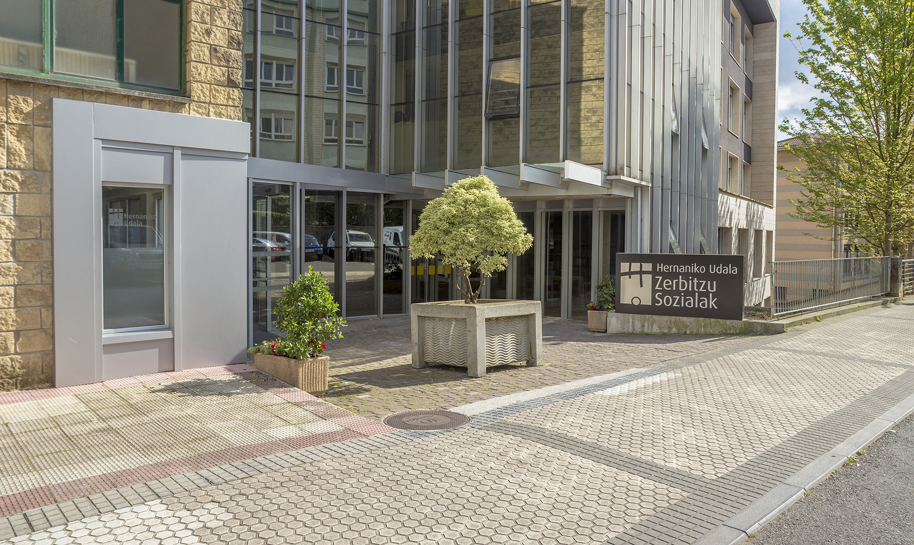 El proyecto crea un nuevo acceso a los Servicios Sociales en la rótula entre el edificio antiguo y su ampliación, recuperando una plaza en mal estado y sin uso.