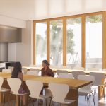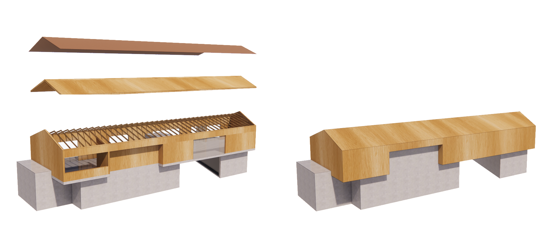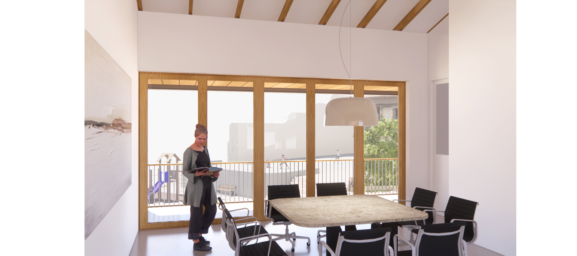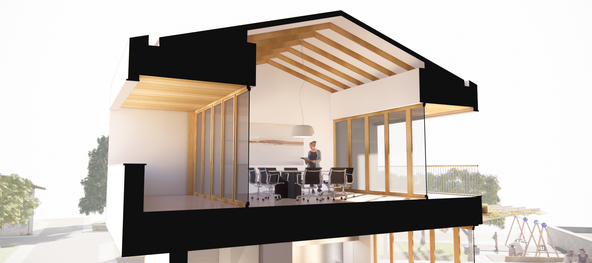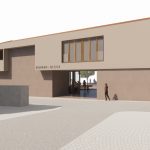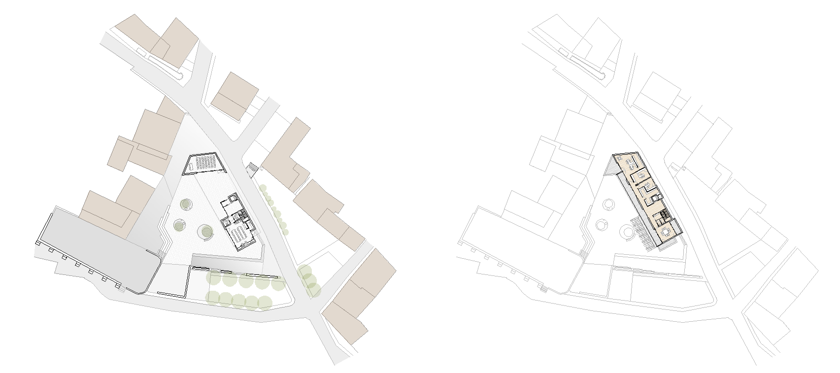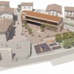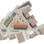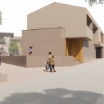La edificación es extremadamente atenta a su entorno más cercano. El cuerpo de planta primera vuela ligeramente sobre los cuerpos de planta baja y se rompe en 2 piezas hacia la calle mayor para fragmentar el volumen y adaptarse a la escala de las edificaciones circundantes.