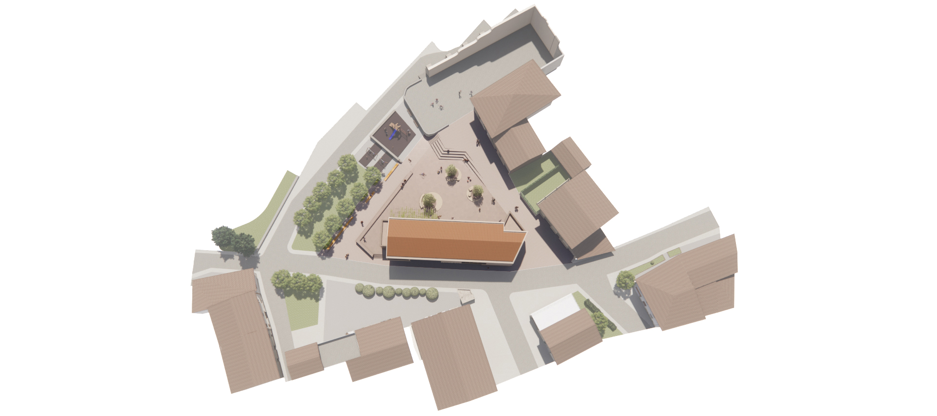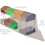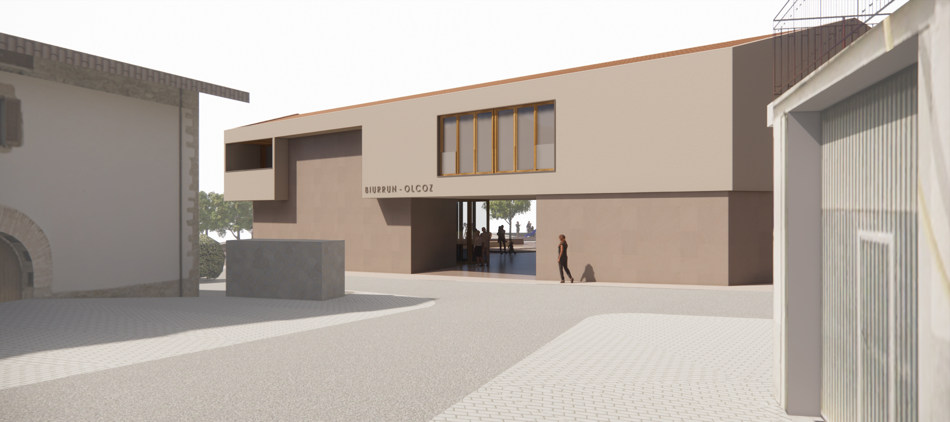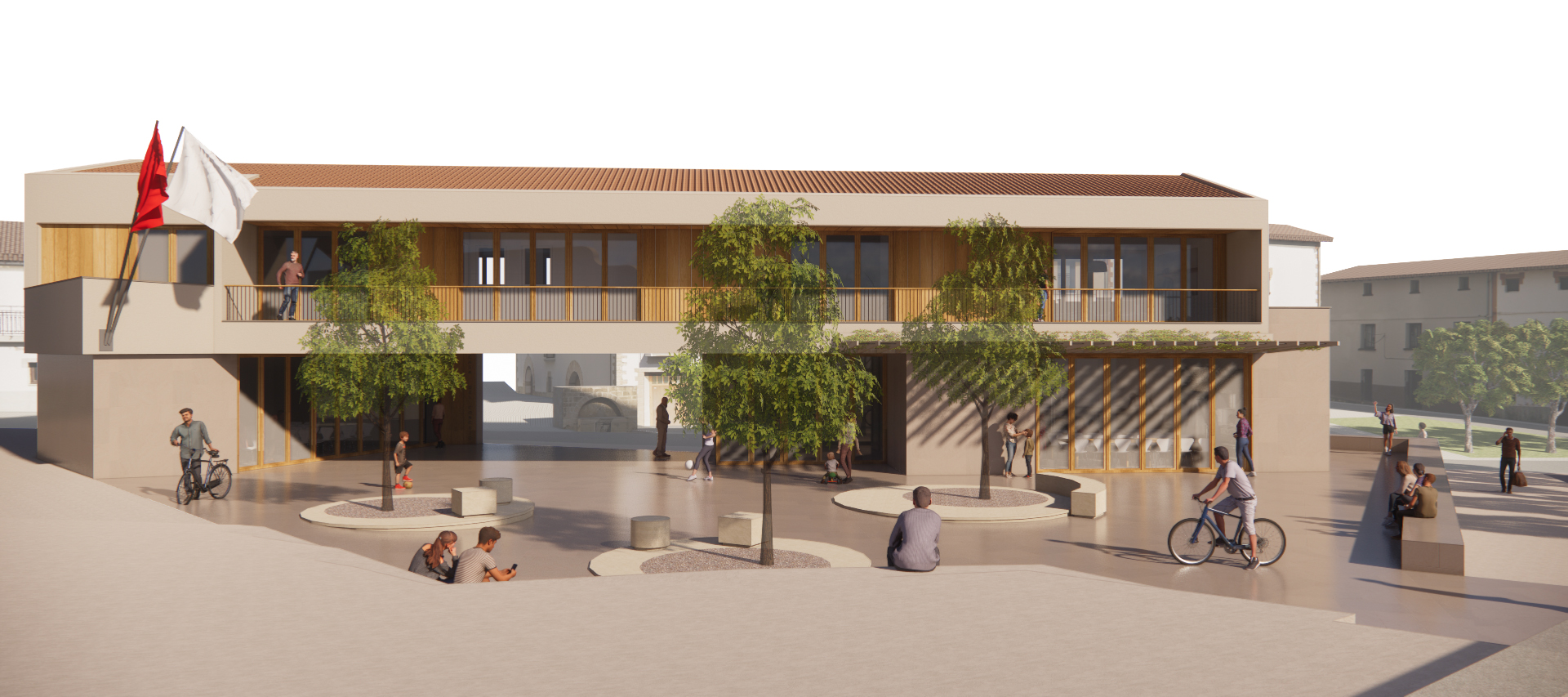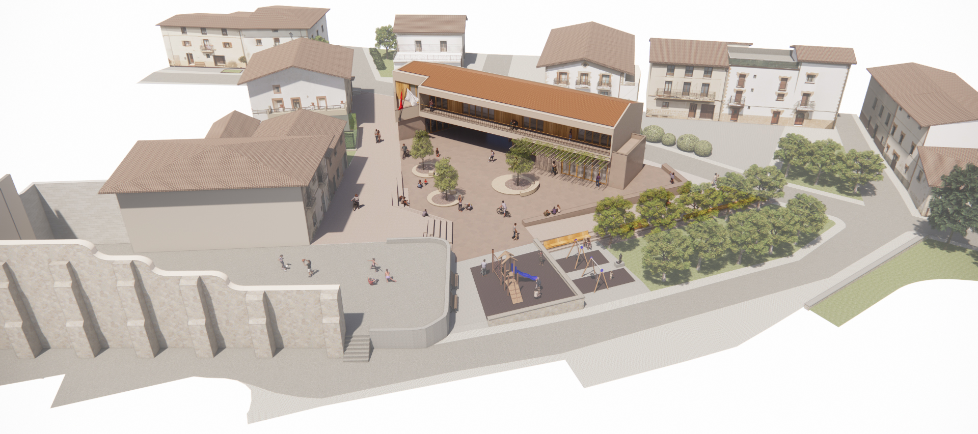 La nueva plaza queda totalmente conectada con las plataformas de la Plaza Jai-Eder y resuelve los problemas de accesibilidad. La disposición de la edificación pone en valor el frontón existente, que queda enfrentado al nuevo Ayuntamiento y a la fuente de piedra, que es otro elemento que nuestra propuesta pretende potenciar.