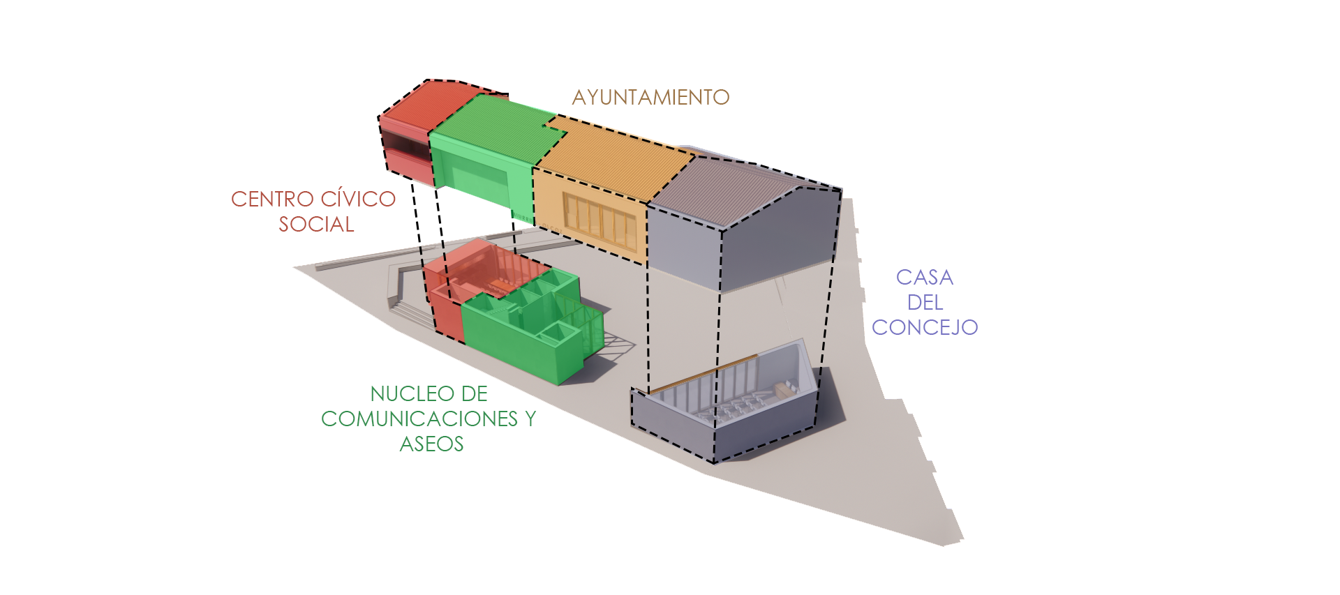 La parte central del edificio en planta baja se vacía generando un porche de acceso al edificio y a la sala de usos múltiples. Este porche funciona a su vez como conexión peatonal de la plaza con la calle mayor y conexión visual con la fuente de piedra, que queda de esta manera vinculada a la plaza.