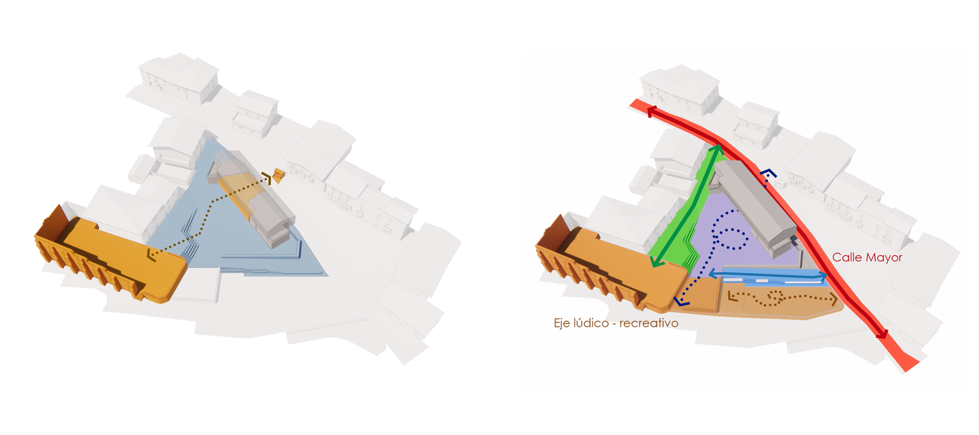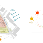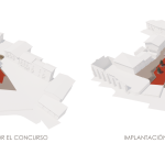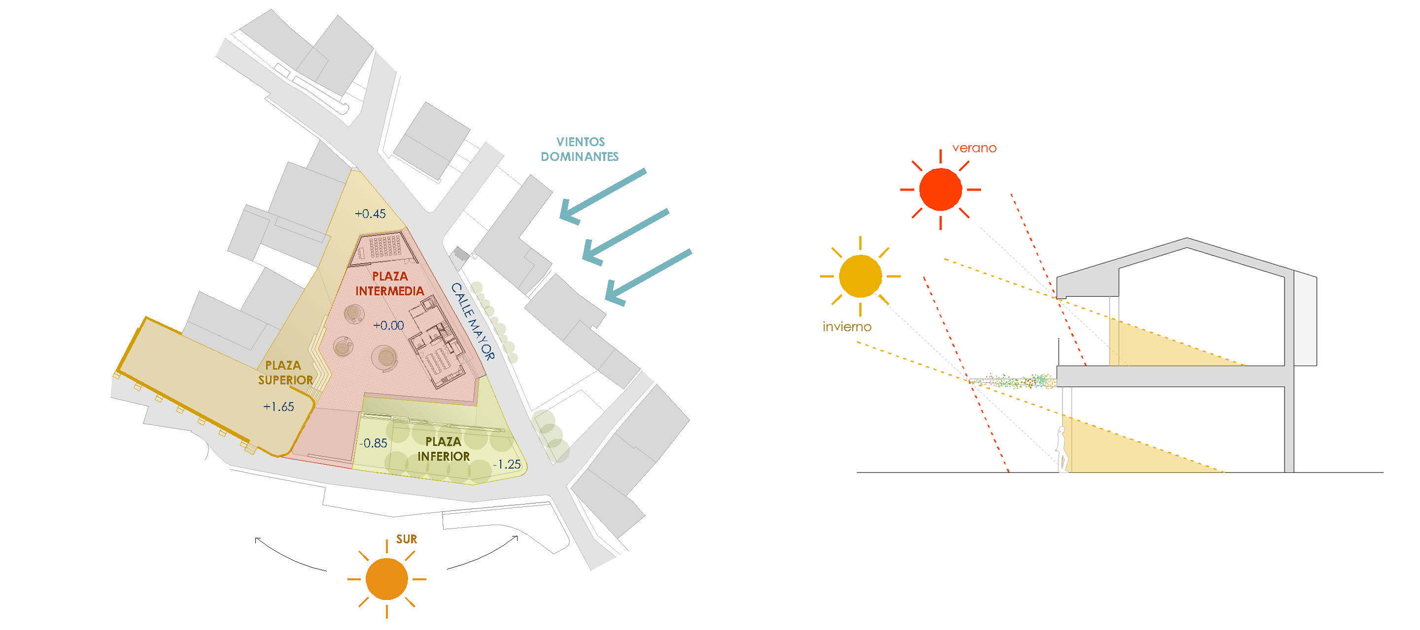 Proponemos situar la edificación en un cuerpo lineal paralelo a la Calle Mayor totalmente orientada al sur-oeste protegiendo la plaza de los vientos dominantes y creando un espacio público orientado al sur.