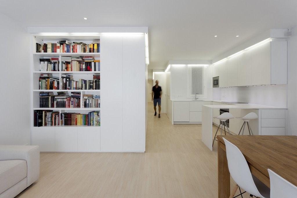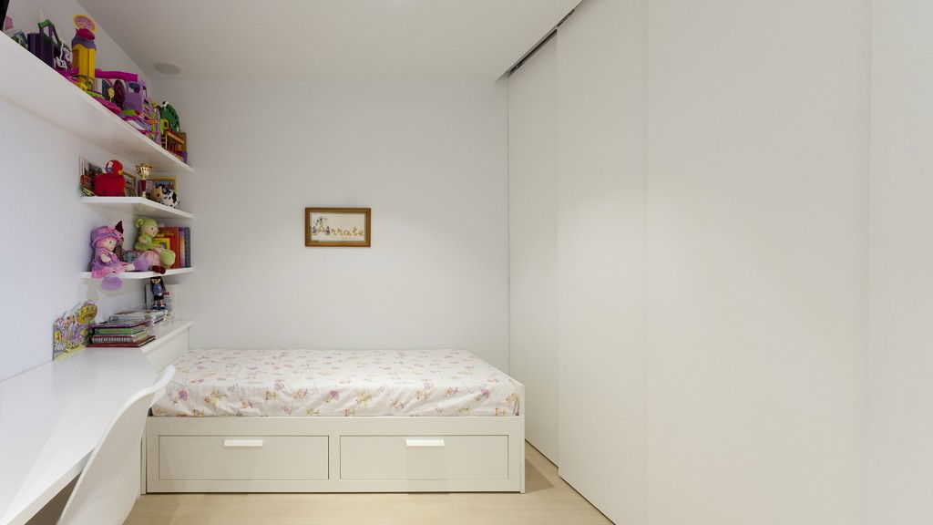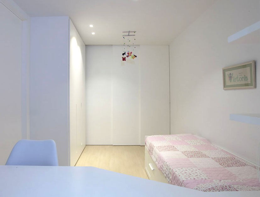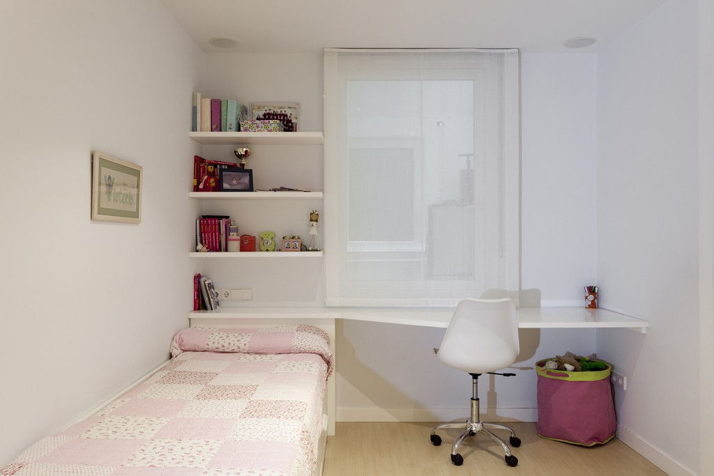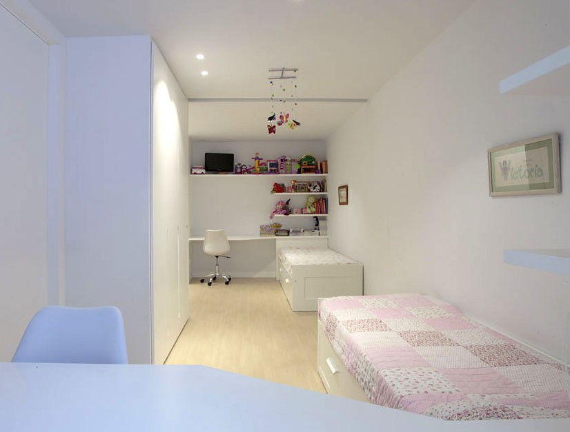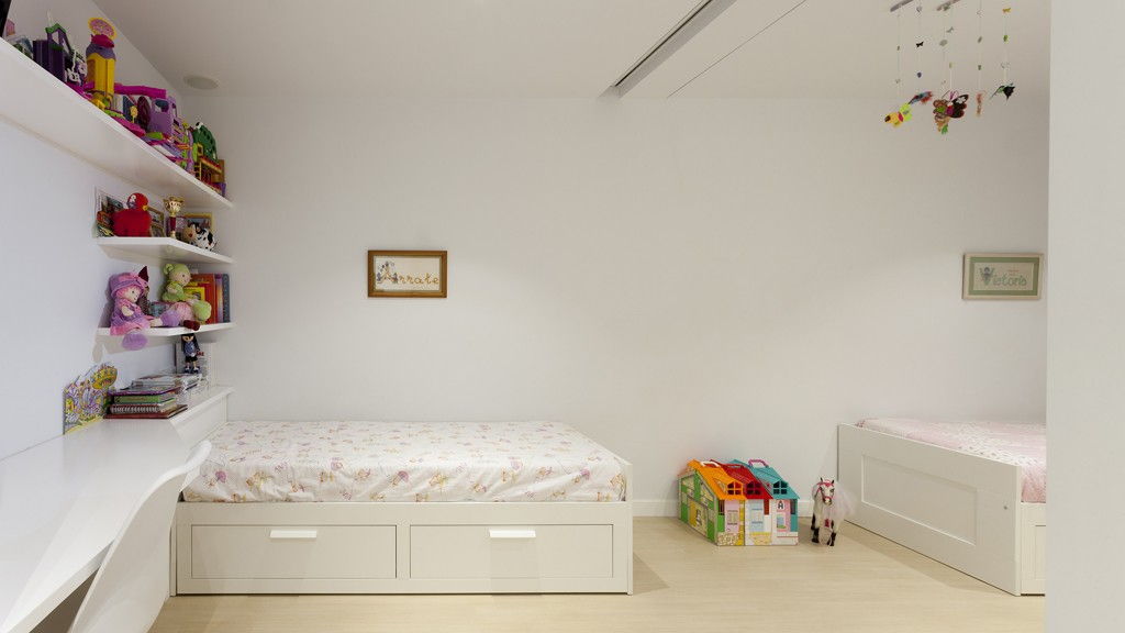En esa misma búsqueda de amplitud y luminosidad, se demuele el tabique que dividía las habitaciones de Victoria y Arrate, las 2 niñas de la familia, y se sustituye por un tabique corredero telescópico que les permite conectar ambos espacios cuando lo deseen.