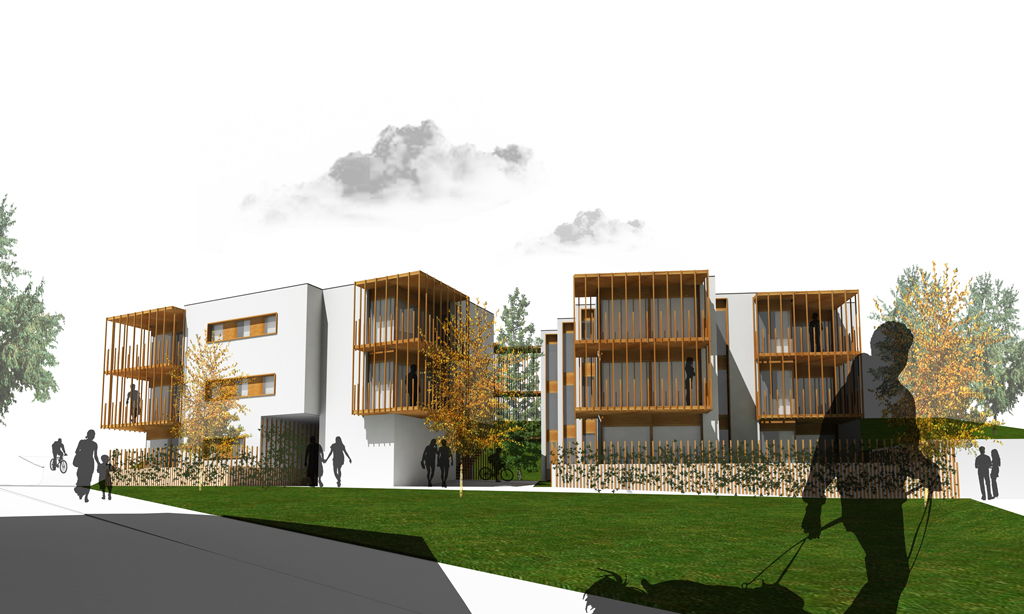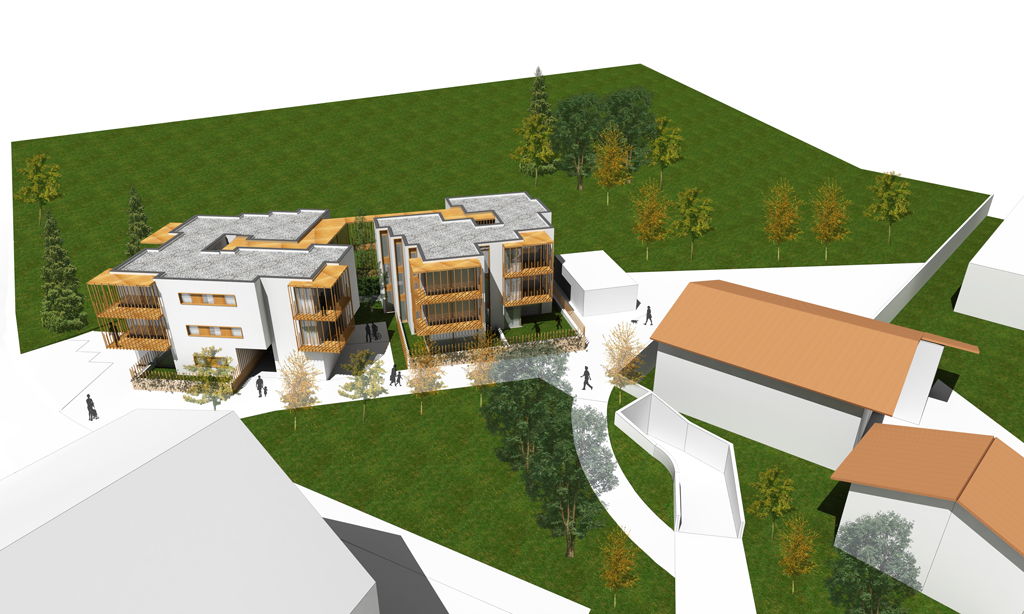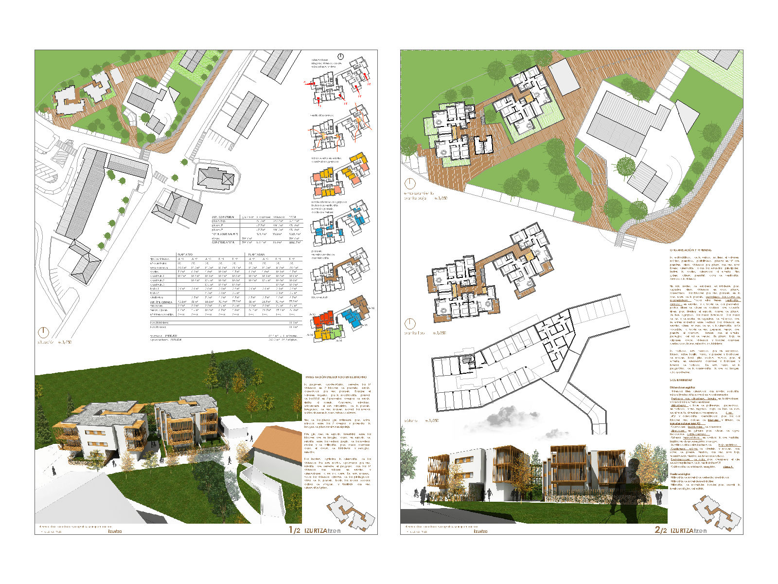 La propuesta arquitectónica resuelve las 14 viviendas en 2 bloques de pequeña escala conectados por una pasarela. Romper el volumen sugerido por la modificación puntual de las NNSS en 2 pequeños cuerpos, de escala similar al caserio Garauntza, soluciona eficazmente el reto urbanistico de la parcela integrando de una manera natural las nuevas edificaciones en la trama urbana de Izurtza.