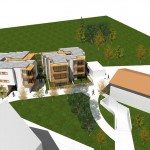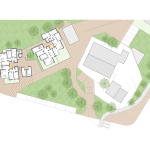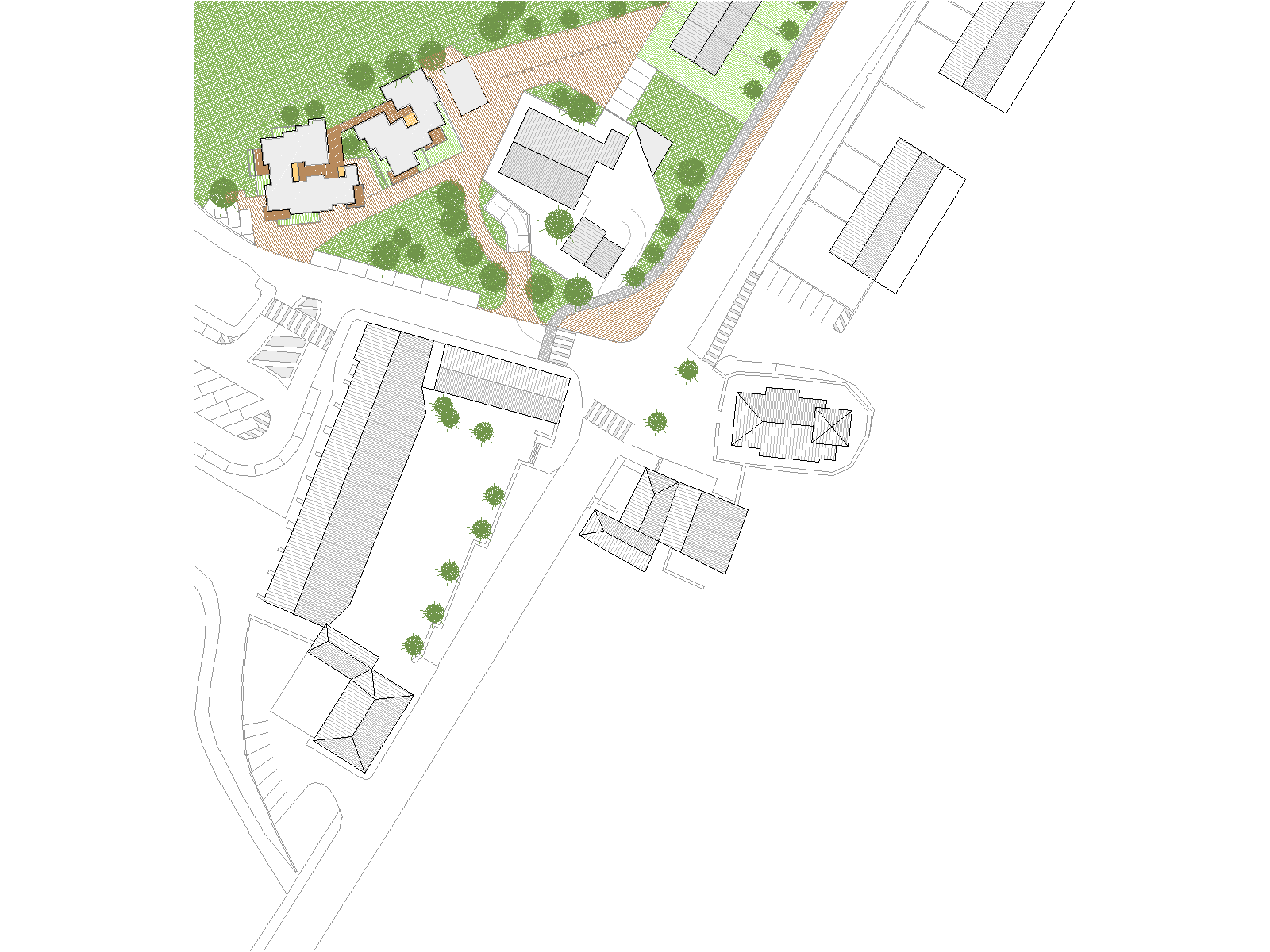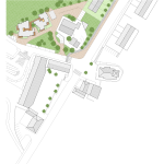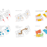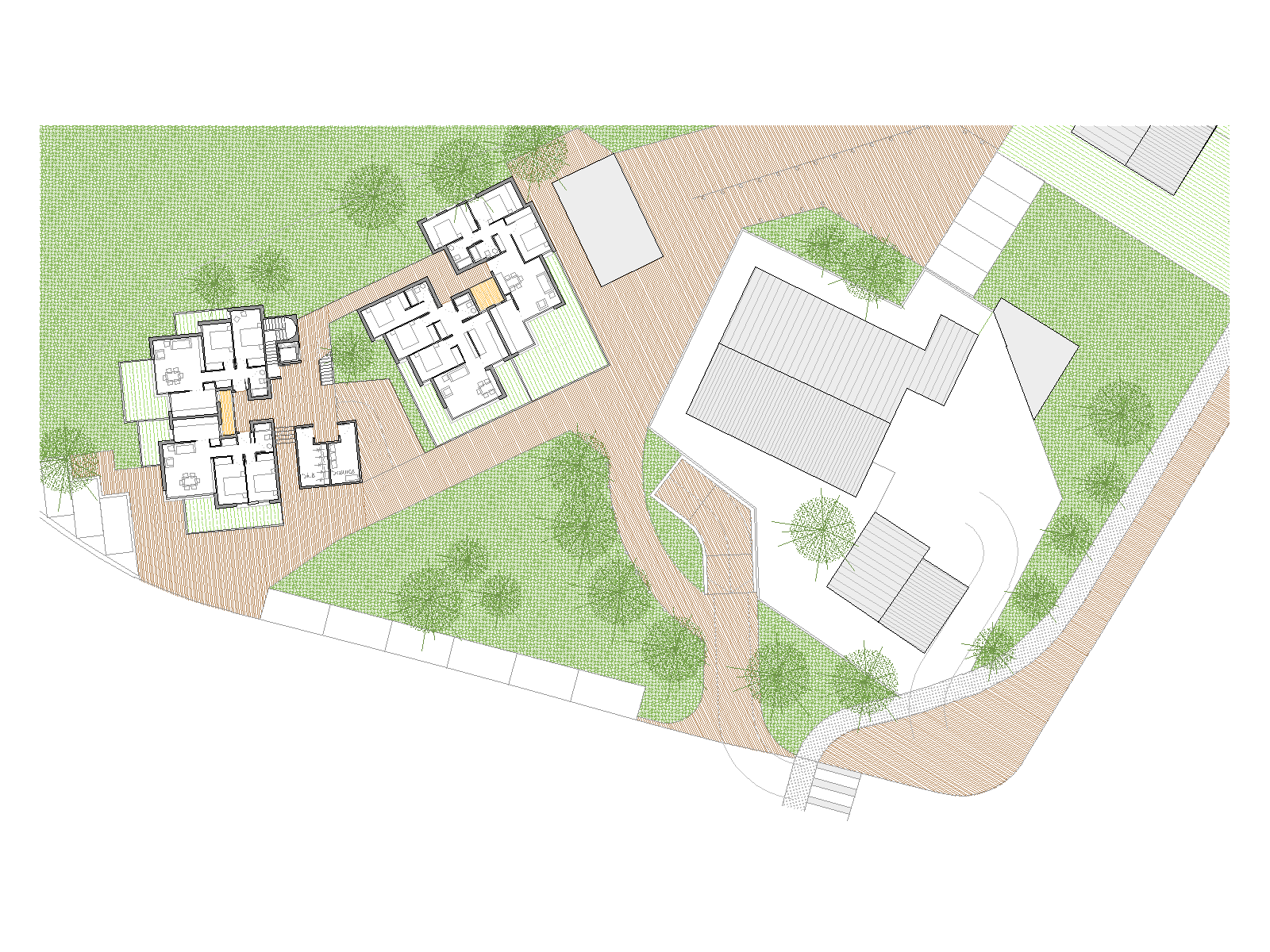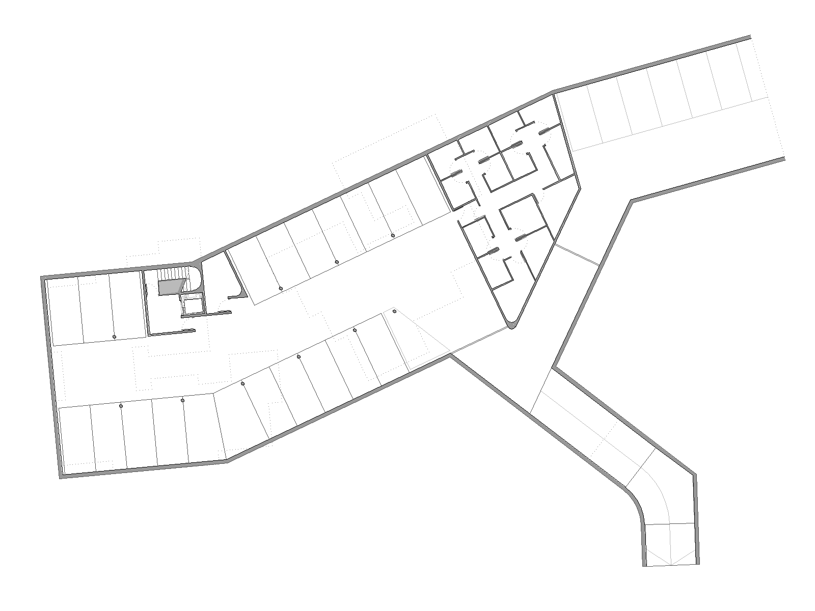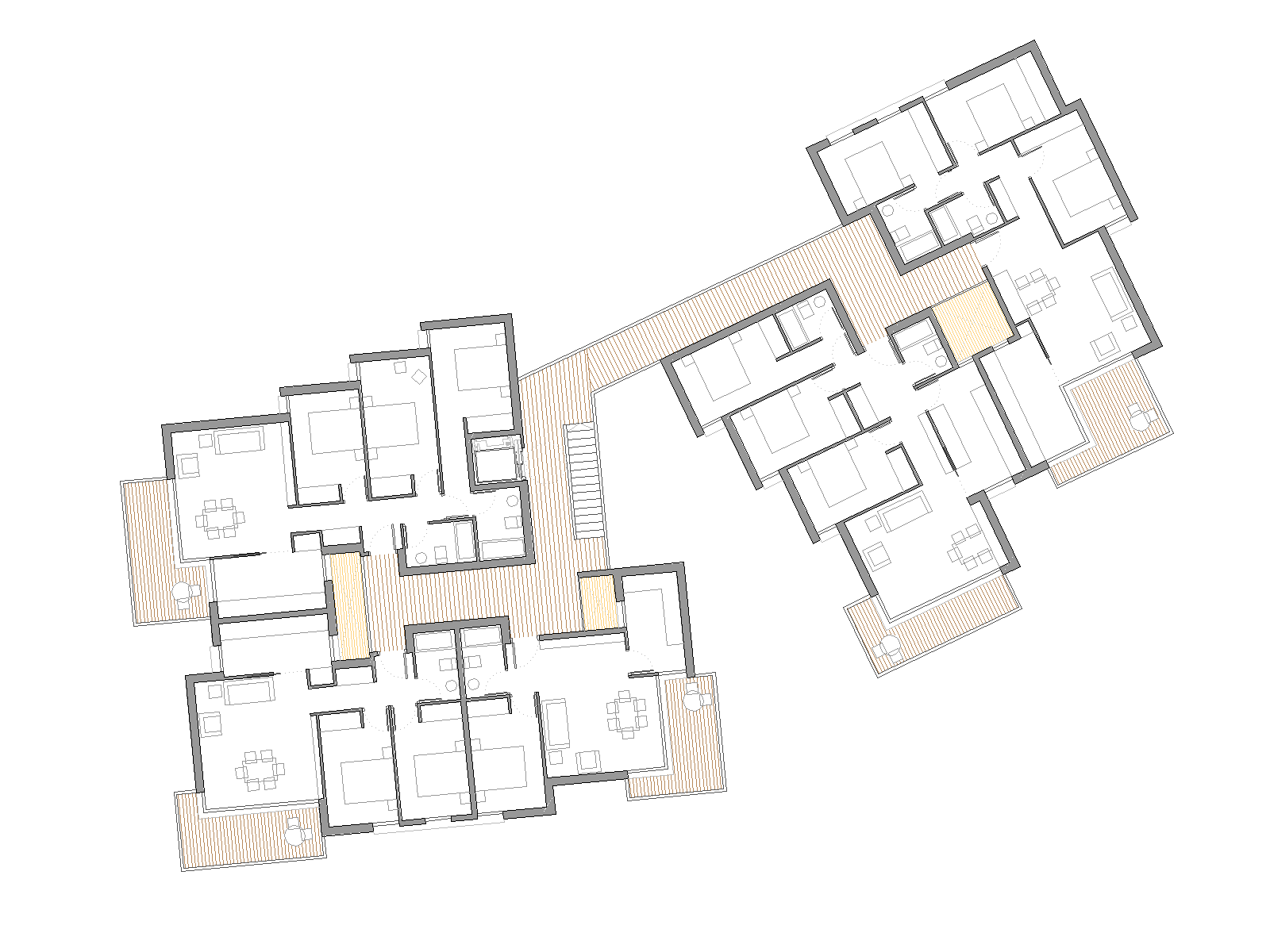 Este giro crea un espacio intersticial entre los bloques que se imagina como un espacio de relación entre los vecinos propio de los núcleos rurales, y de utilización para zonas comunes como el cuarto de bicicletas y recogida selectiva.