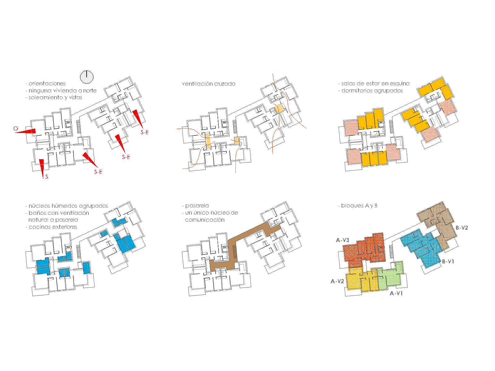 Un solo núcleo de escaleras es suficiente para organizar cinco viviendas en cada planta, conectando los bloques por una pasarela en la cara norte de la parcela, reduciendo los gastos de mantenimiento. Todas ellas tienen ventilación cruzada, en esquina y a través de dos pequeños patios, libres de olores de cocinas, que además sirven para iluminar el espacio común de planta. Se han agrupado las zonas húmedas. Las zonas de día y de noche se organizan de tal modo que se eviten molestias entre vecinos. Las viviendas en esquina abren su zona de día a la orientación más favorable, a través de una generosa terraza que permite el contacto intenso con el exterior protegido del sol de verano. En planta baja se disponen cuatro viviendas y locales comunes destinados a basura selectiva y a bicicletas.