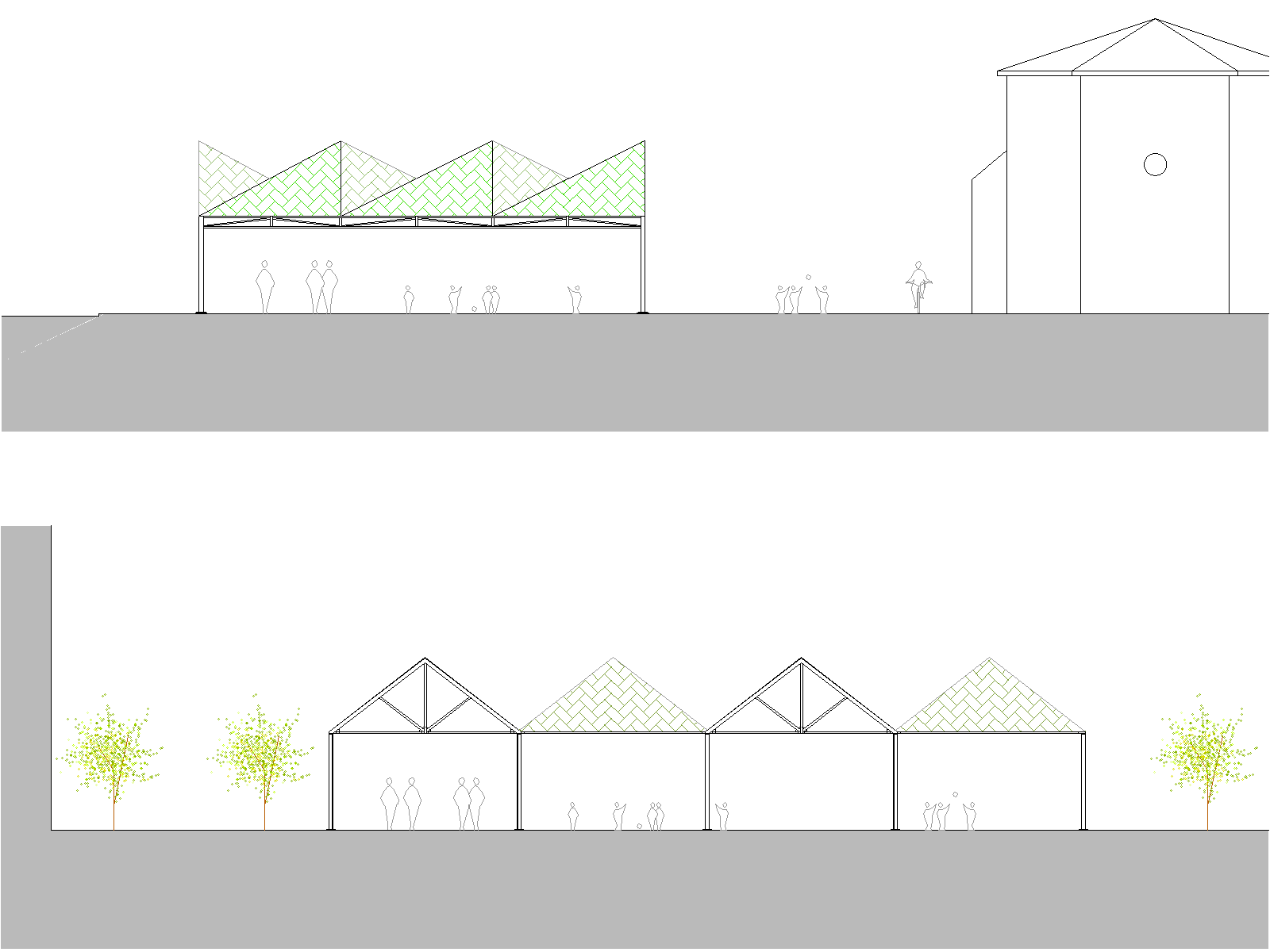 Se resuelve la estructura con solamente 10 apoyos metálicos, ya que se colocan unas cerchas horizontales que resuelven los 16m de luz con facilidad. De esta manera se consigue generar una plaza continua que completa la trama peatonal que comunica la casa de cultura, la ermita y el ayuntamiento e incorpora cómodamente la nueva cubierta al espacio urbano existente.
