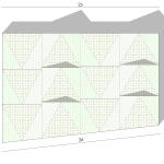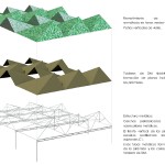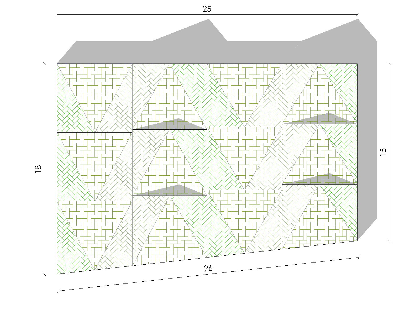 Ya que la cubierta es la 5ª fachada de la actuación y la más visible desde todas las viviendas circundantes se decide revestirla de cerámica esmaltada en tonos verdes y blancos en homenaje a la villa. Los faldones de las pirámides se resolverán con diferentes tonalidades para potenciar la volumetría del conjunto.