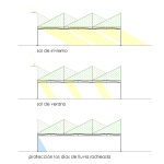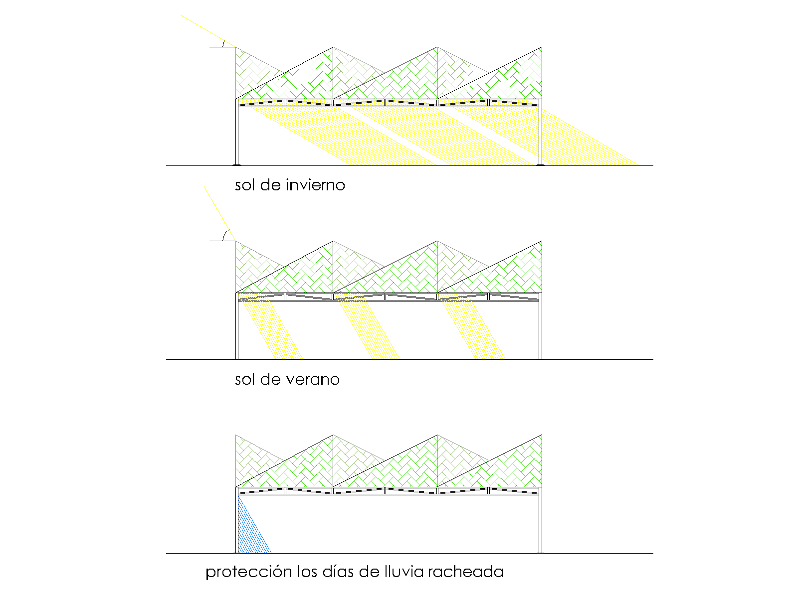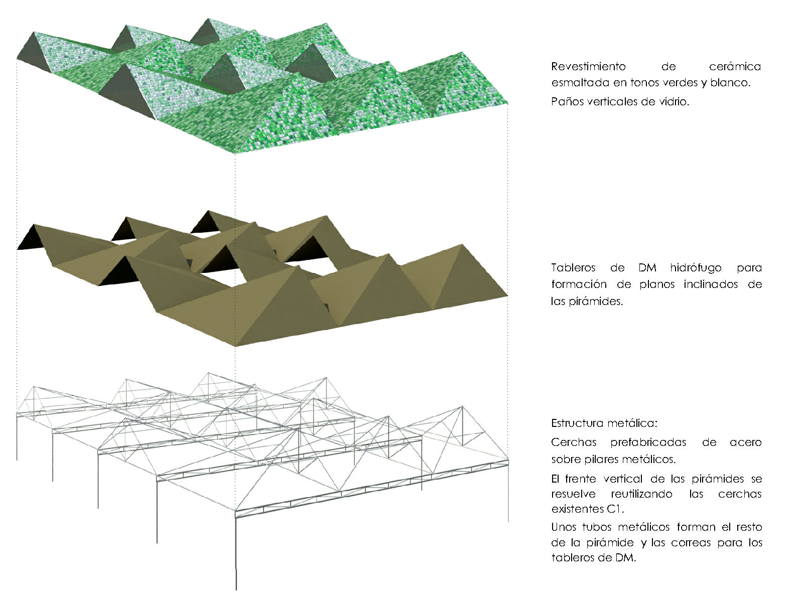 Para dotar de iluminación natural al pabellón se decide utilizar las cerchas a modo de lucernarios verticales y cerrar el espacio entre ellas con tableros de DM revestidos de cerámica esmaltada en su exterior creando unas pirámides independientes. Se orientan 6 pirámides al nor-este y las otras 6 al sur-oeste asegurando que siempre estén la iluminados la mitad de los lucernarios.