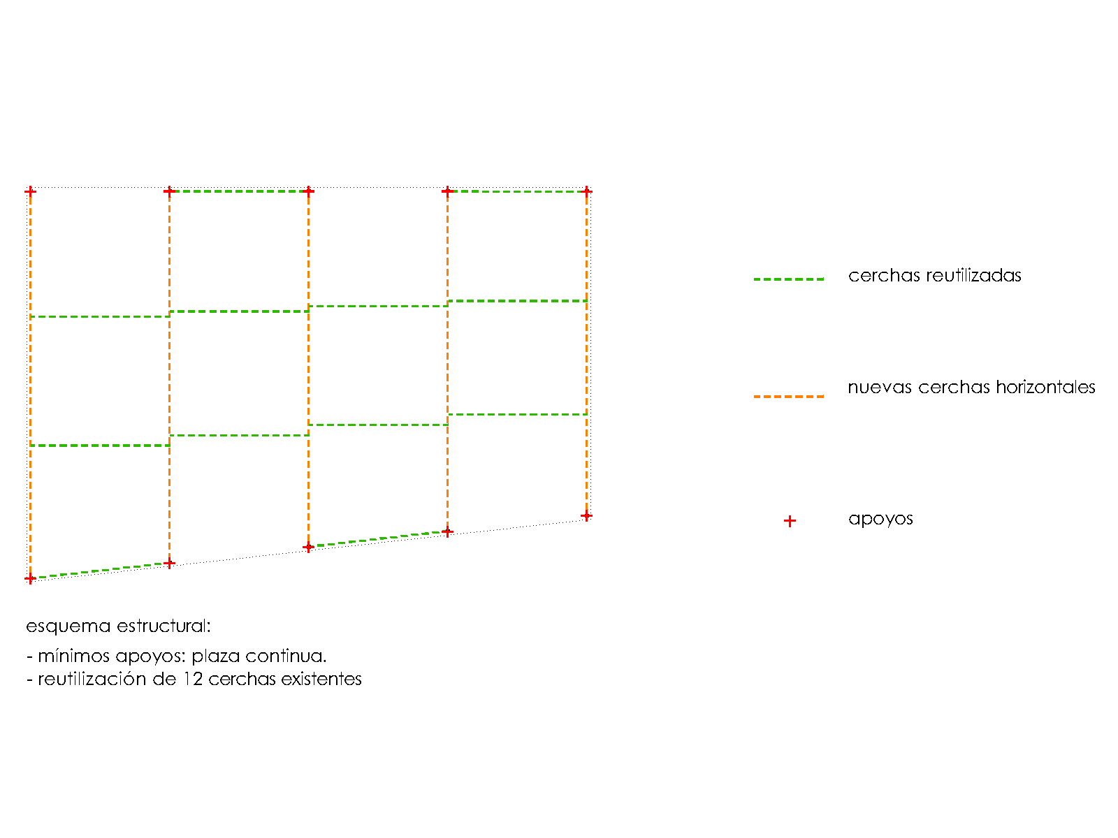 La primera gran decisión del proyecto es reutilizar las cerchas de la estructura actual. Es indudable su valor arquitectónico y se encuentran en perfecto estado de conservación. Además, reutilizar la estructura permite ajustar el presupuesto y reducir costes. Se reutilizan 12 de las 15 cerchas C1.