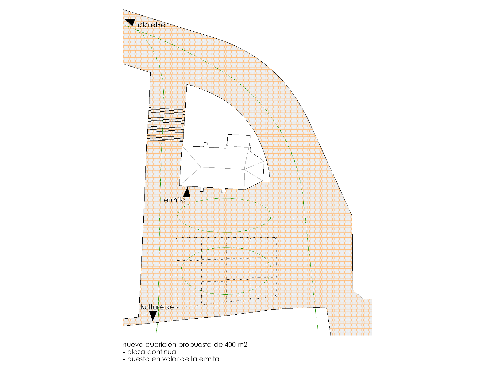 El proyecto apuesta por crear un espacio rectangular de una superficie equivalente al espacio en U actual. Generar un espacio diáfano de 25 x 16 m junto a la calle landako kalea permite alejarse 12 m de la ermita de San Antón poniéndola en valor y dotándola de un acceso digno.
