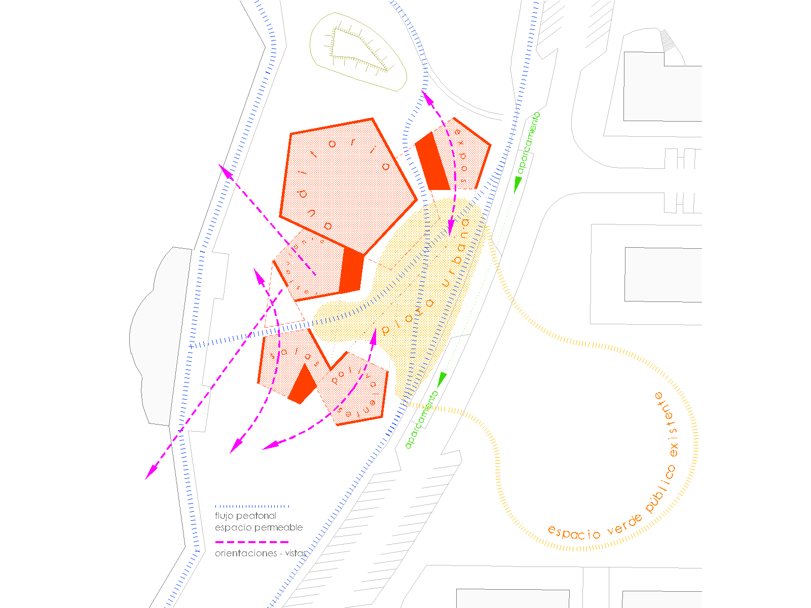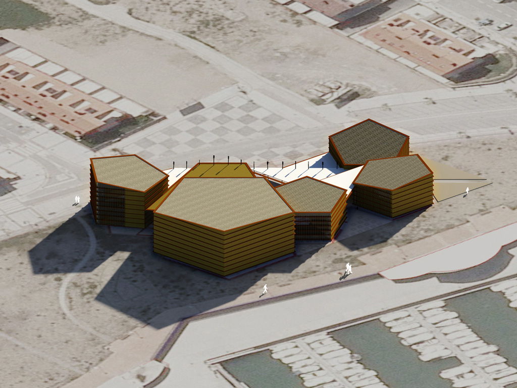 El proyecto propone fragmentar el edificio en 5 volúmenes independientes estratégicamente dispuestos en la parcela para generar una plaza urbana que los relaciona entre ellos y con la ciudad. El resultado es una intervención totalmente permeable que conecta el paseo urbano con el paseo marítimo y ofrece visuales inesperadas al peatón.
