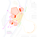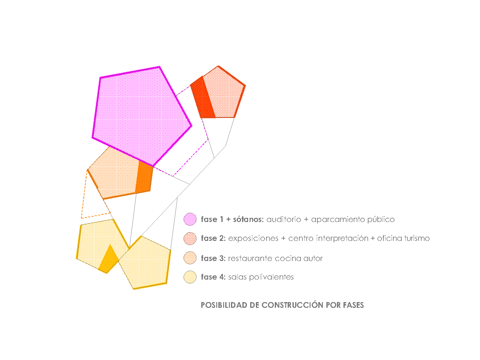 La fragmentación en piezas responde a unas necesidades programáticas concretas. De esta manera, el tamaño y la volumetría de cada cuerpo se define según el uso que contiene. Al vincular cada espacio y sus características a un tipo de uso cada pieza adquiere una identidad clara en el conjunto. Esta segregación permite la posibilidad de construir por fases de una manera gradual y con mínima interferencia en el parque y la vida cotidiana de esta zona de la villa.