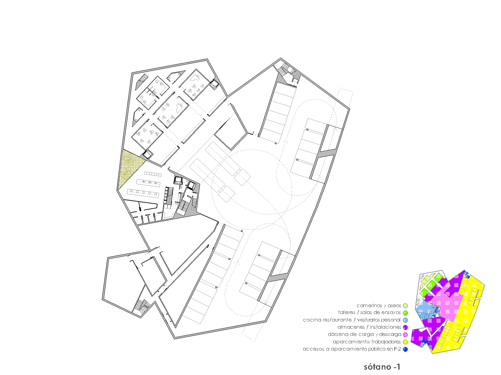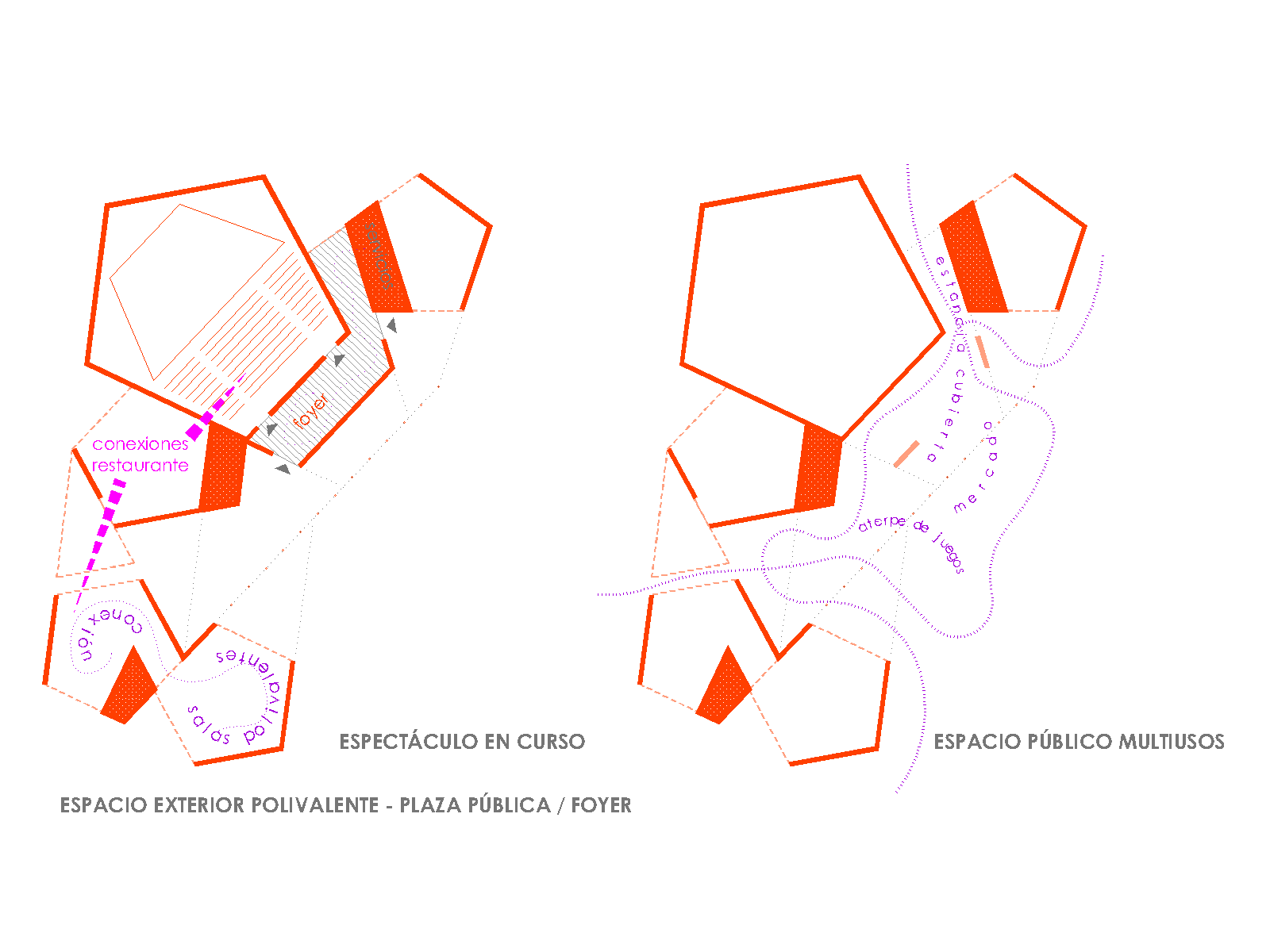 Por último el RESTAURANTE es un elemento colocado a modo de rótula entre las salas polivalentes y el auditorio, pudiendo dar servicio a ambos usos. Este cuerpo provee de servicios al complejo y a la ciudad y es a la vez generador de actividad y usuarios.