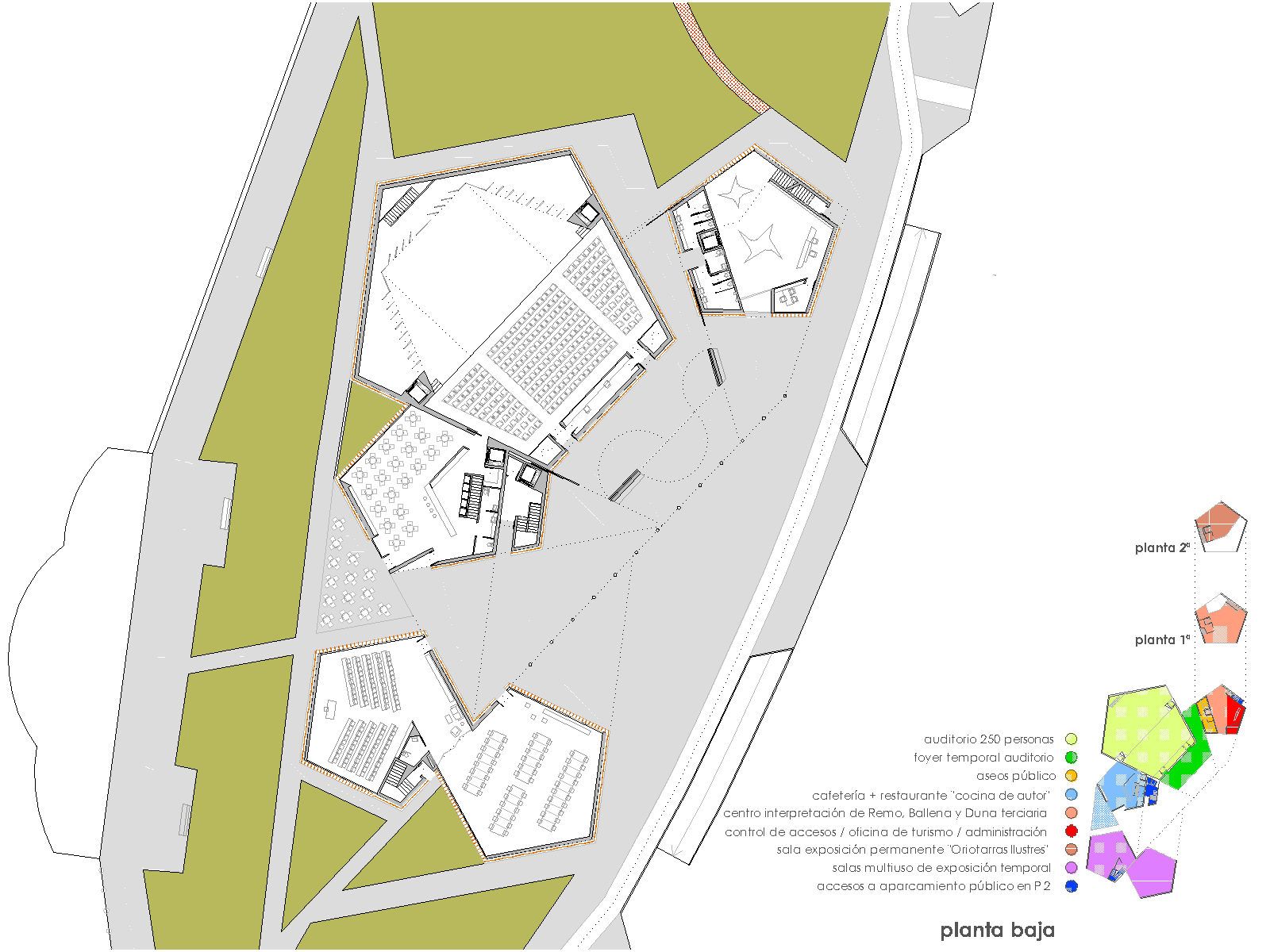 Los edificios se organizan entre ellos de forma multilítica sobre el mar y la arena, como las dunas o los barcos del puerto. Como las propias edificaciones tradicionales de la villa, donde los espacios públicos se protegen y sus accesos son resguardados.