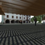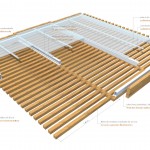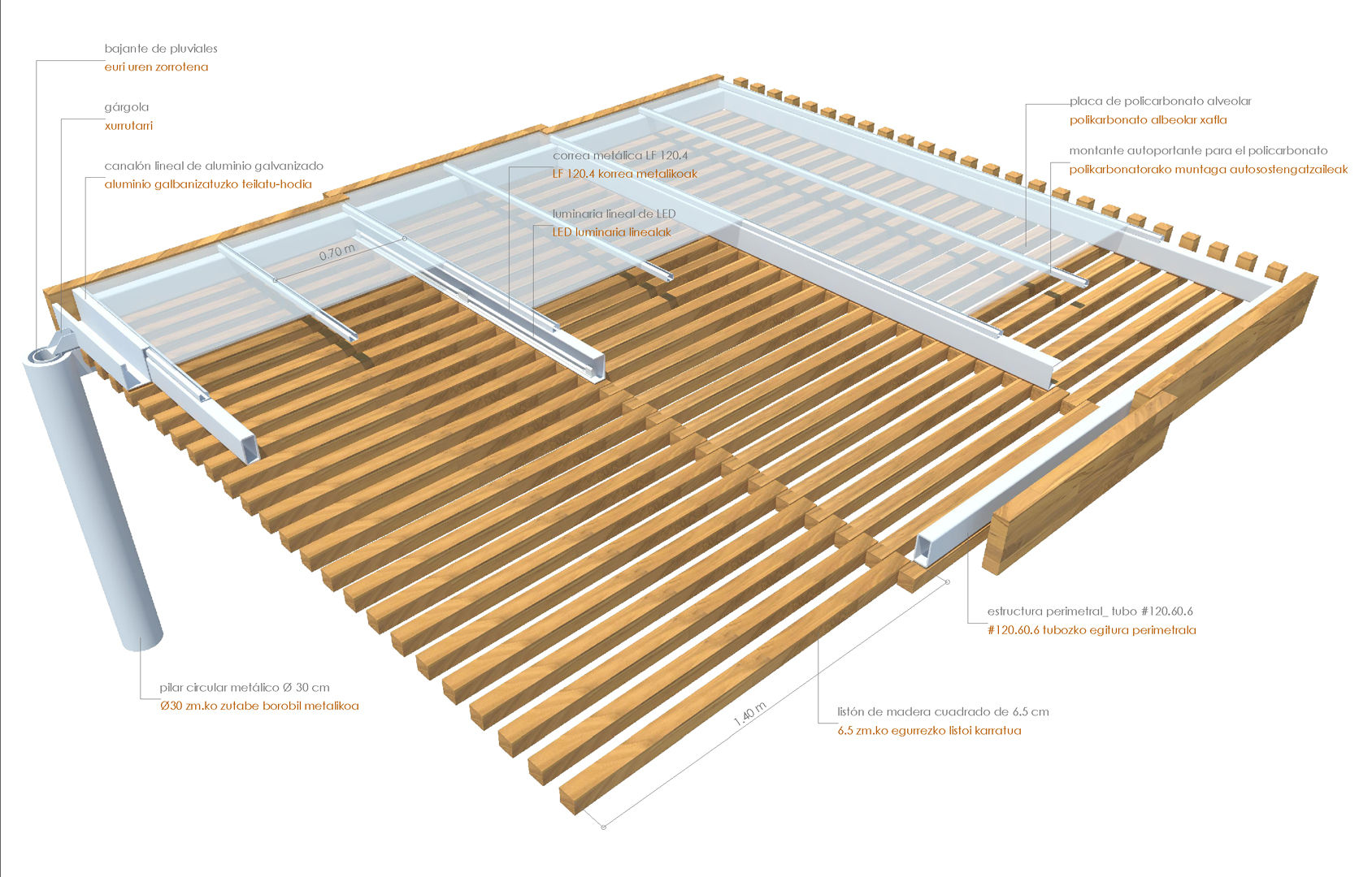 Por ello, proponemos unas cubiertas formadas por un entramado de listones de madera cuadrados de 6.5 cm de lado y 140 cm de longitud. Estos listones se colocarán a modo de celosía dejando pasar la luz entre ellos. Sobre ellos, un cierre transparente de policarbonato protege el conjunto de la lluvia.