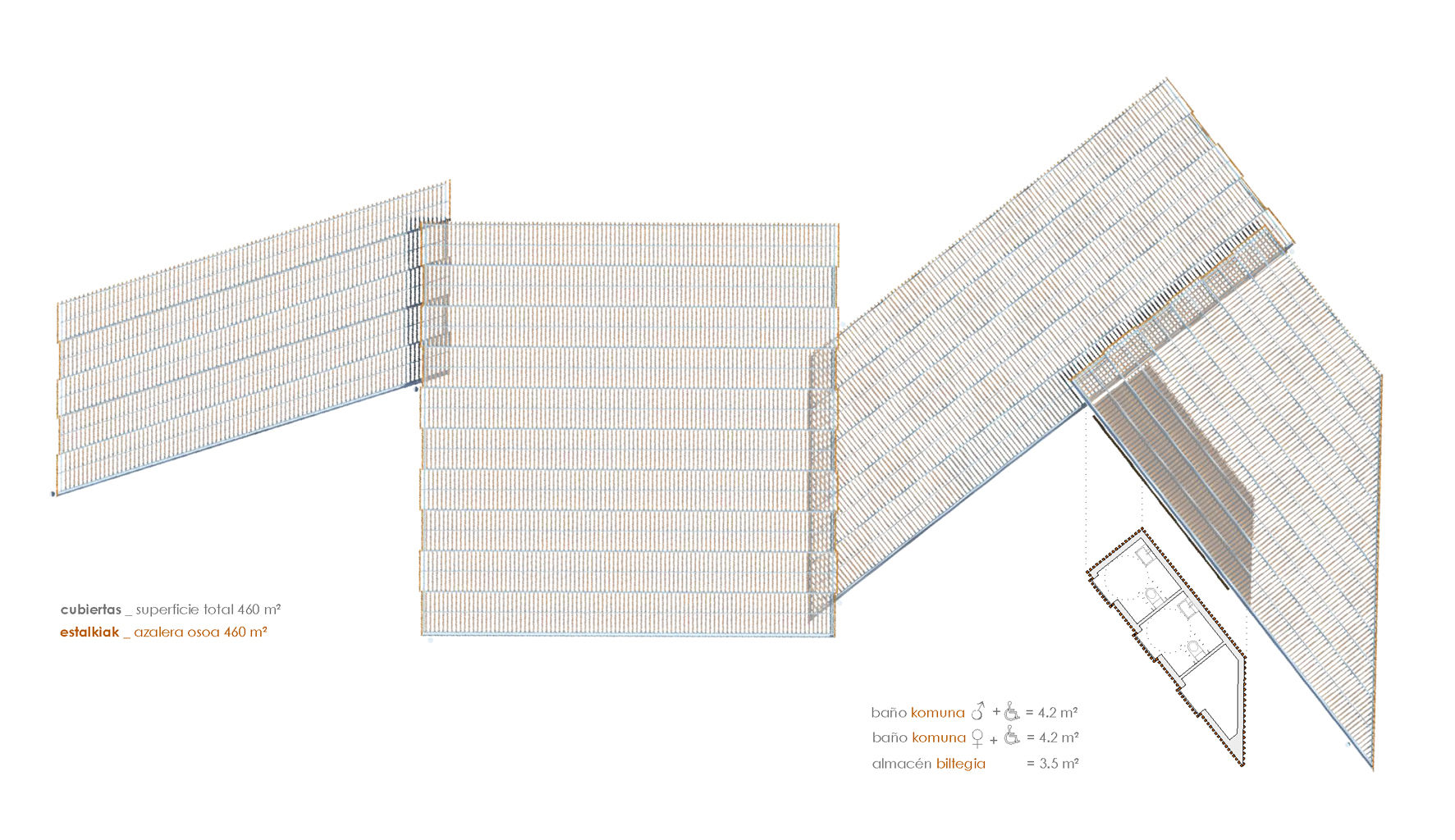 En la rótula de unión entre las 2 cubiertas, los listones de madera bajan al suelo para forrar el cuerpo que aloja los baños y el almacén. El acceso se realizará desde la calle trasera de las viviendas y será totalmente accesible cumpliendo la normativa vigente.