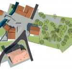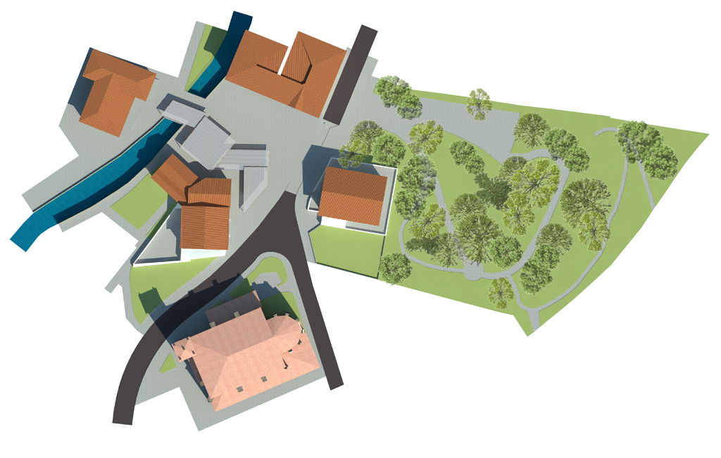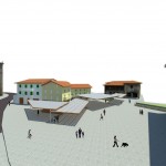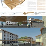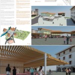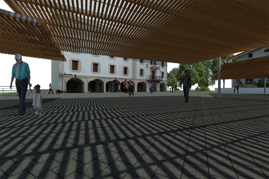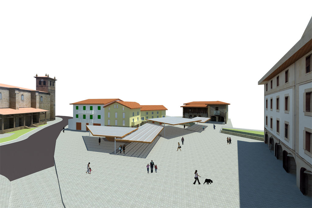 Las cubiertas se sitúan copiando el límite dibujado por los edificios de viviendas y se extienden hasta el puente que comunica con el ayuntamiento dejando libre y descubierto el espacio central de la plaza. La geometría se adapta con cuidado al espacio urbano respetando y potenciando los edificios públicos existentes, marcando ejes de movimiento y generando espacios de estancia bajo cobijo de diferentes proporciones aptos para diferentes usos.