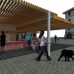 El resultado serán unas livianas marquesinas de madera que el peatón percibirá ingrávidas ya que toda su estructura portante quedará oculta tras el entramado de madera y apoyará solamente en 7 pilares metálicos circulares estratégicamente ubicados para minimizar apoyos.