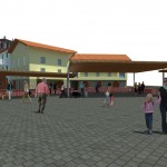 Una gran cubierta cuadrada de 13.5 m de lado genera un espacio central cubierto de 185 m2 y 3.6m de altura libre apto para colocar un escenario y alojar diferentes usos a su cobijo: comidas populares, entregas de premios, exposición de productos, conciertos o bailes.