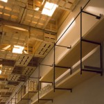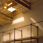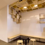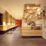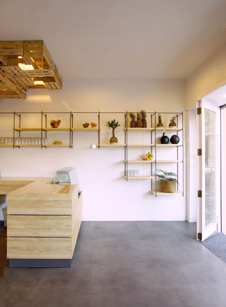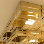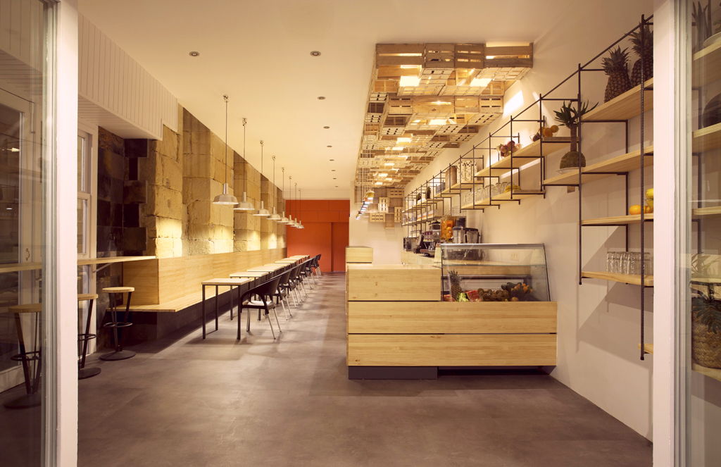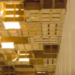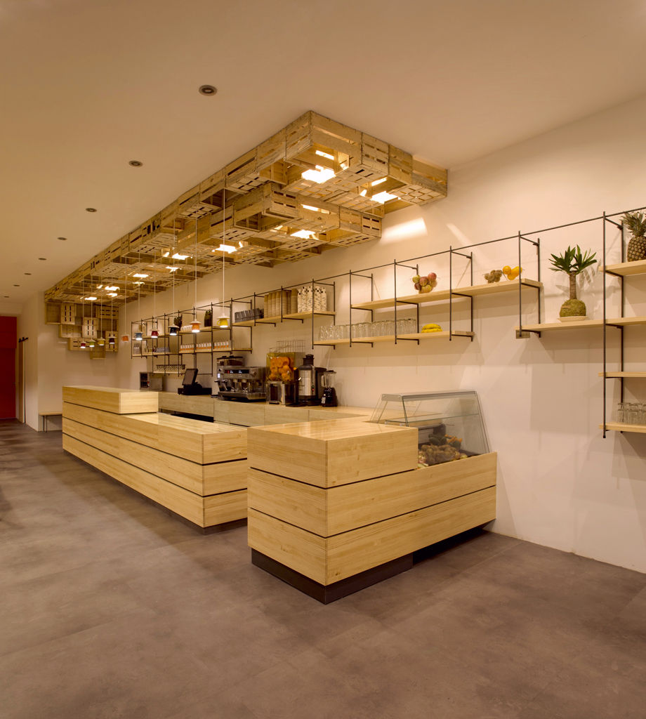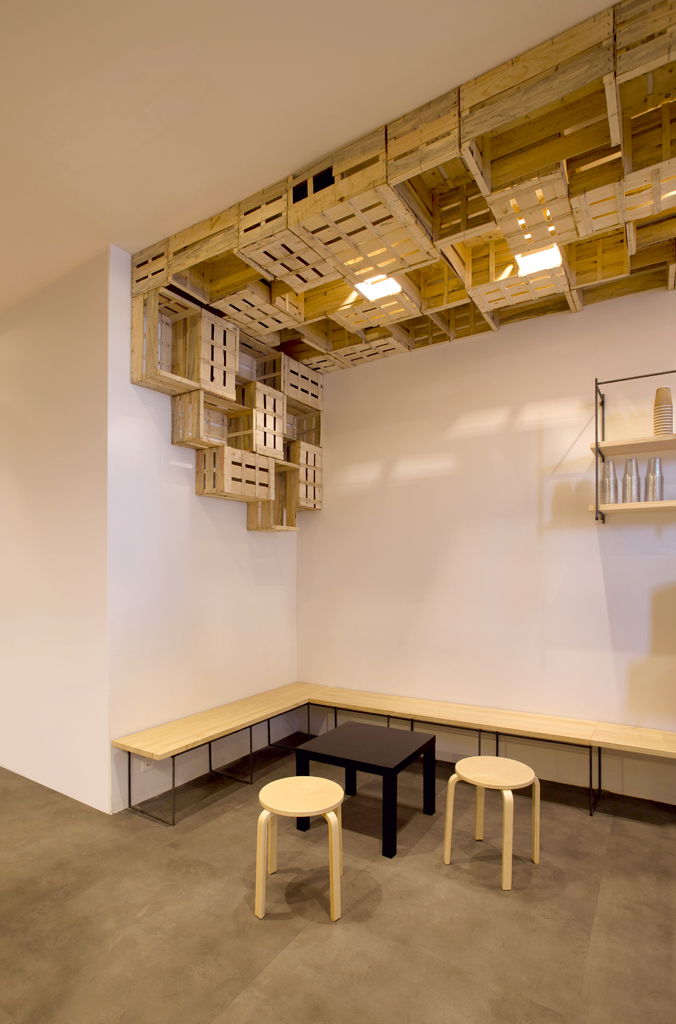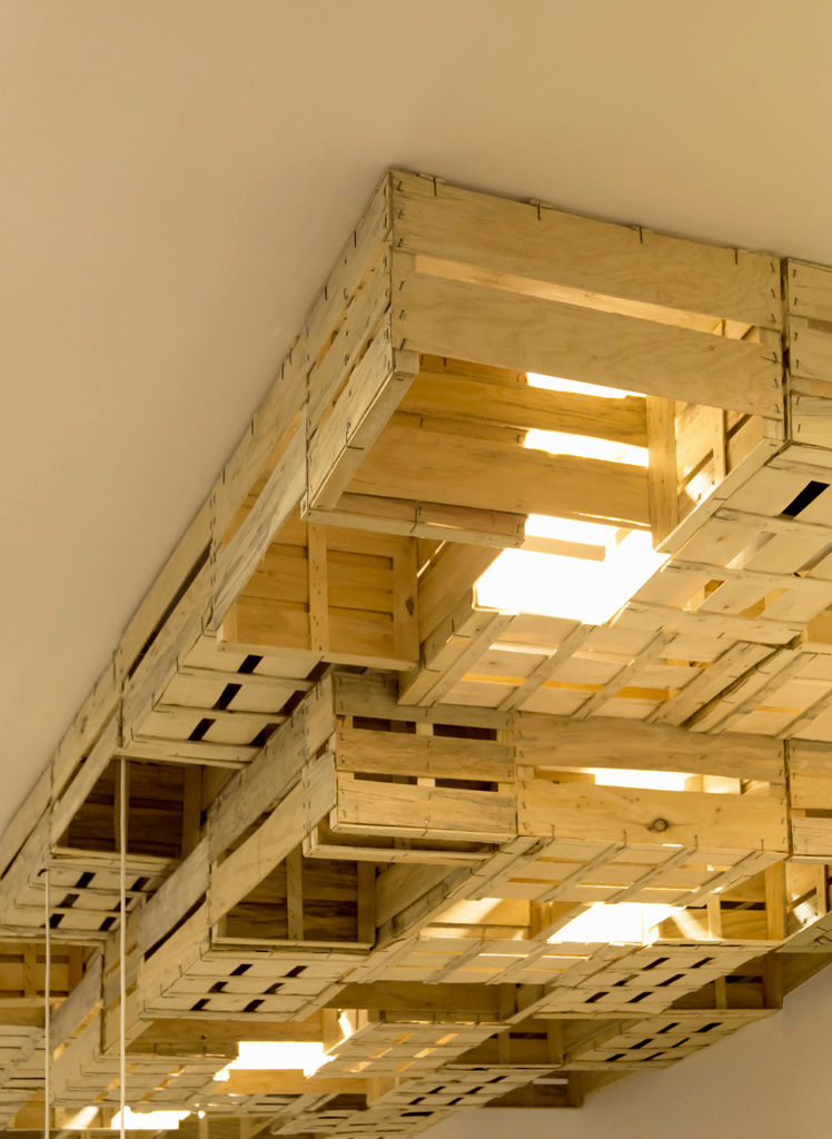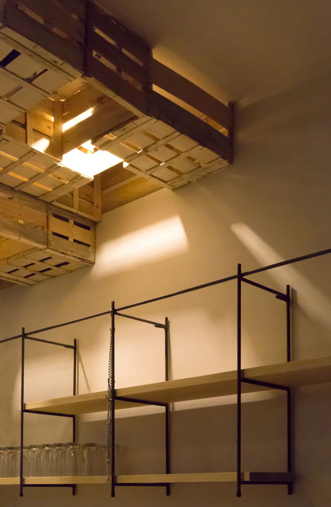En el techo, para ocultar la iluminación de la barra, los altavoces y los conductos de climatización, se colocan de manera aparentemente desordenada unas cajas de fruta recicladas que se prolongan hasta la pared del fondo y dan personalidad al local.
