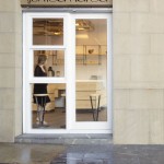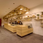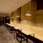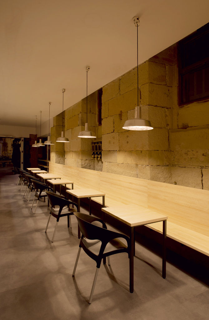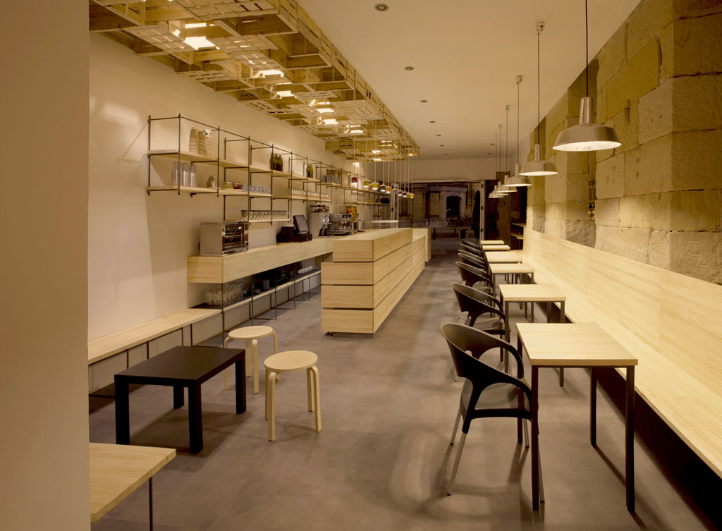 El local abusa del color blanco y de los tonos claros para optimizar la luz natural y el confort visual en un clima poco luminoso en invierno, como el de San Sebastián. Acompañan a este fondo neutro y claro el banco corrido y el mostrador de madera de pino natural que dan calidez al local.