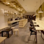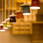 Se reciclaron las pantallas de las lámparas sobre las mesas cambiándoles el cordón para convertirlas en colgantes y los taburetes existentes sustituyendo el asiento por una tabla de madera. Las lámpara-taza sobre la barra son de fabricación propia.