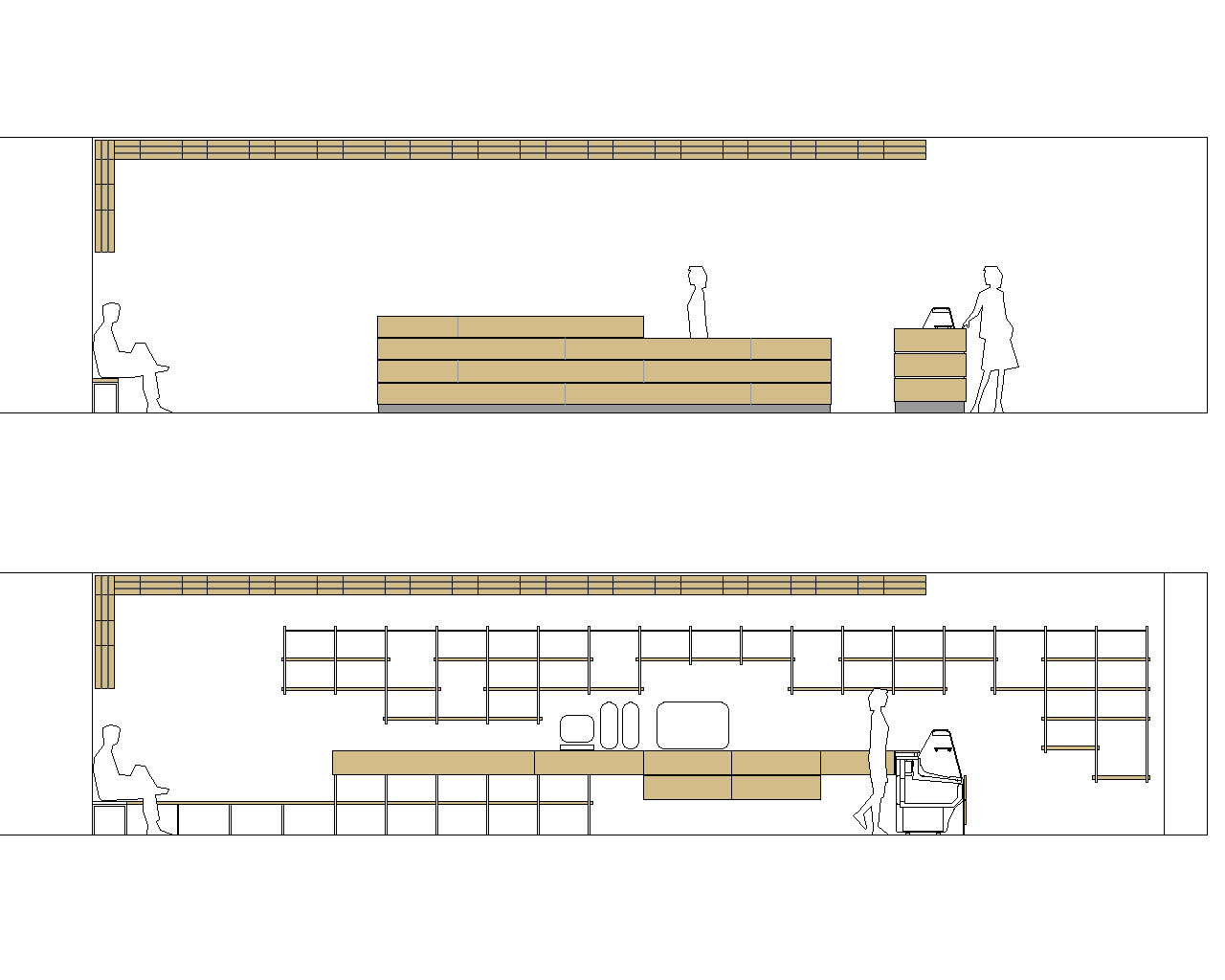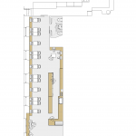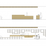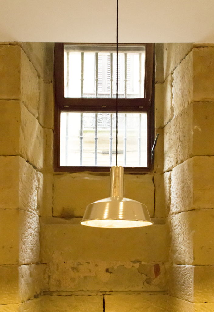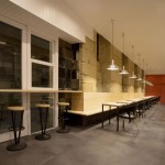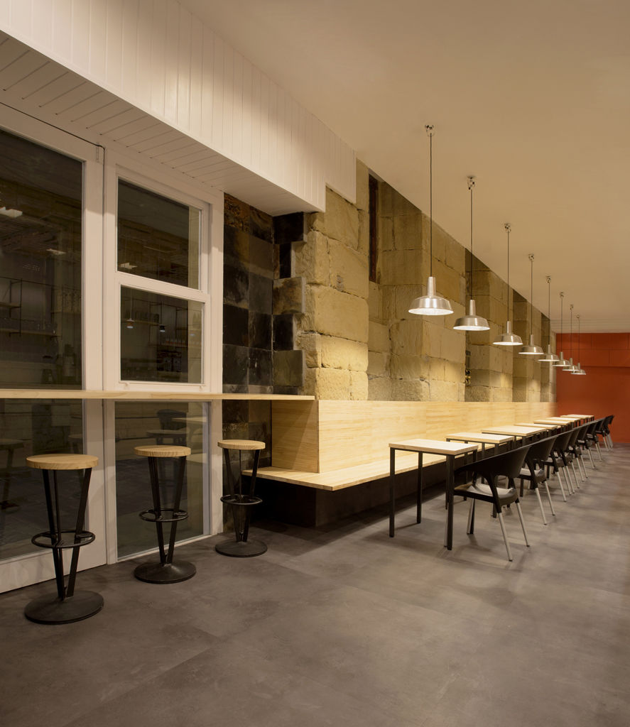 Decidimos colocar la barra a la derecha y ocupar con un enorme banco corrido el muro de piedra arenisca. De esta manera se genera un eje central de circulación que comunica con baños y cocina y se aprovecha todo el fondo del local.