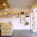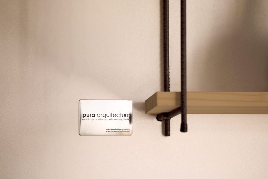 Unas estanterías de barras de acero corrugado soldadas in situ y tablas de madera de pino se extienden a lo largo de la pared blanca acompañando a la barra y adaptando su geometría a las necesidades de cada zona de mostrador.