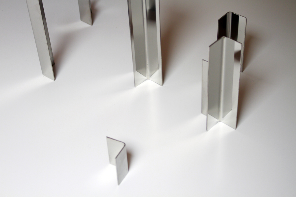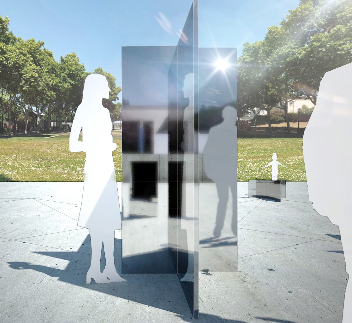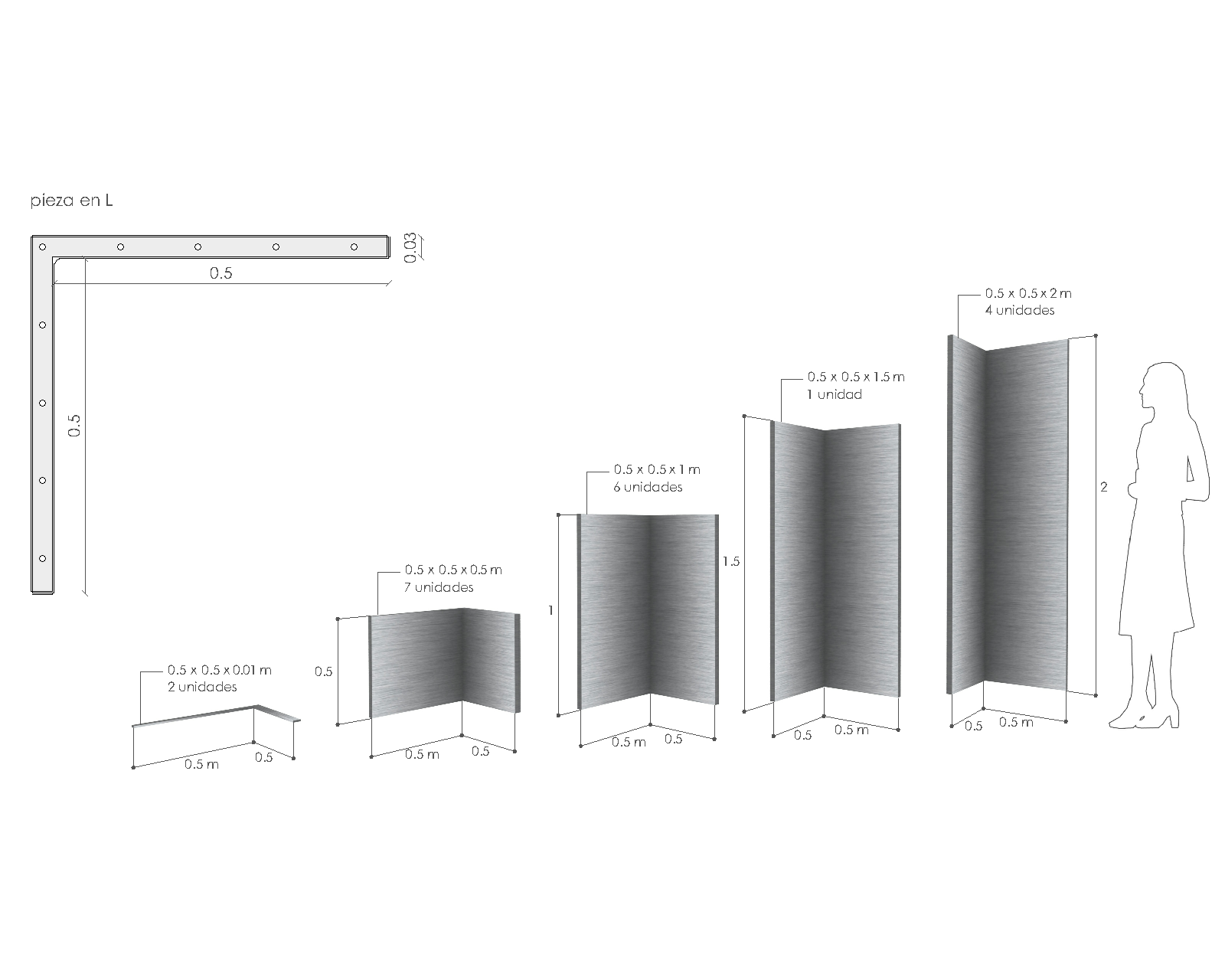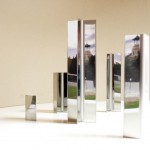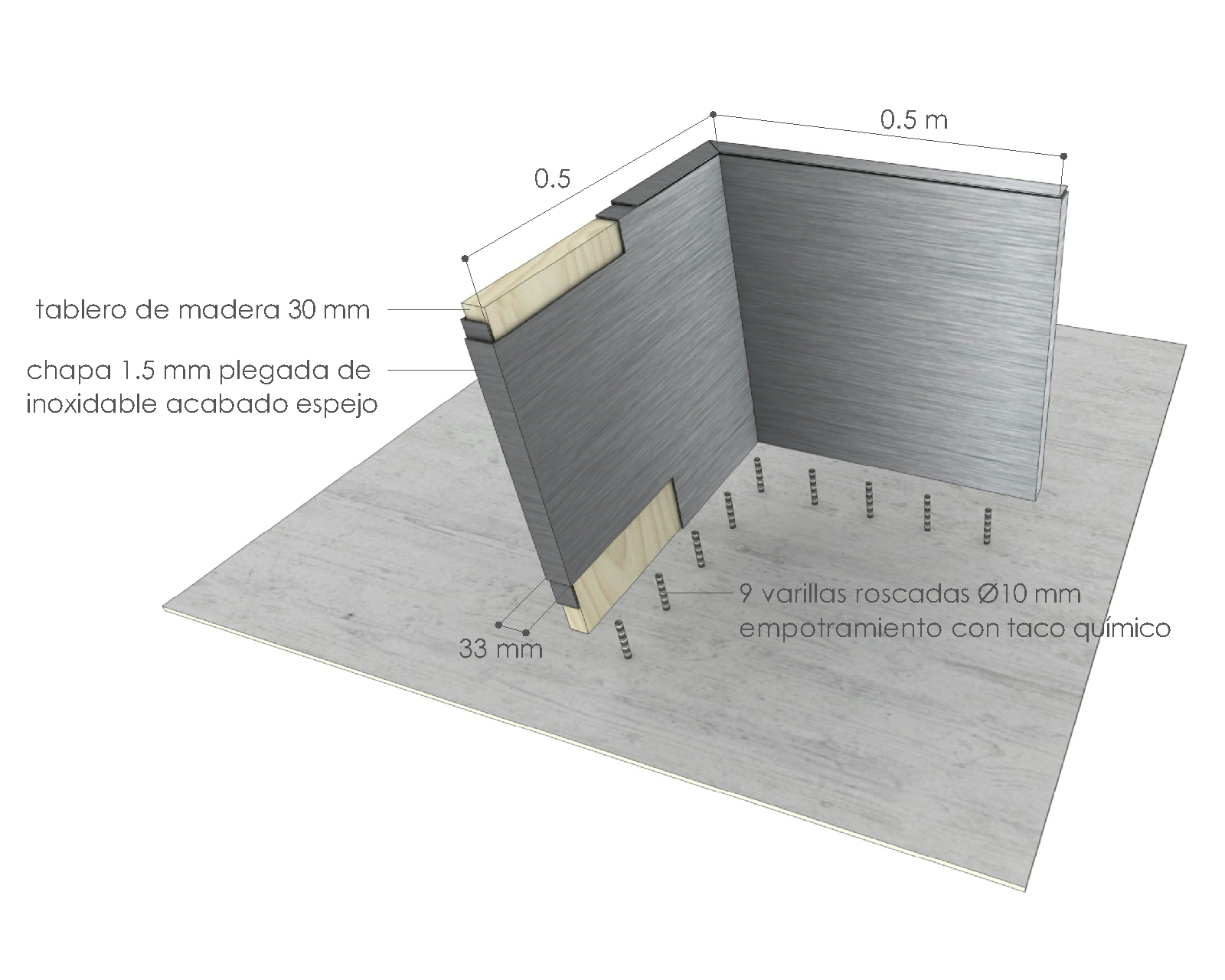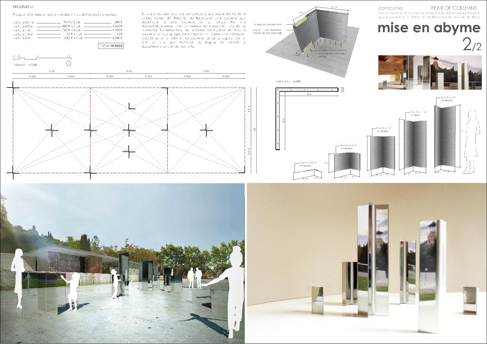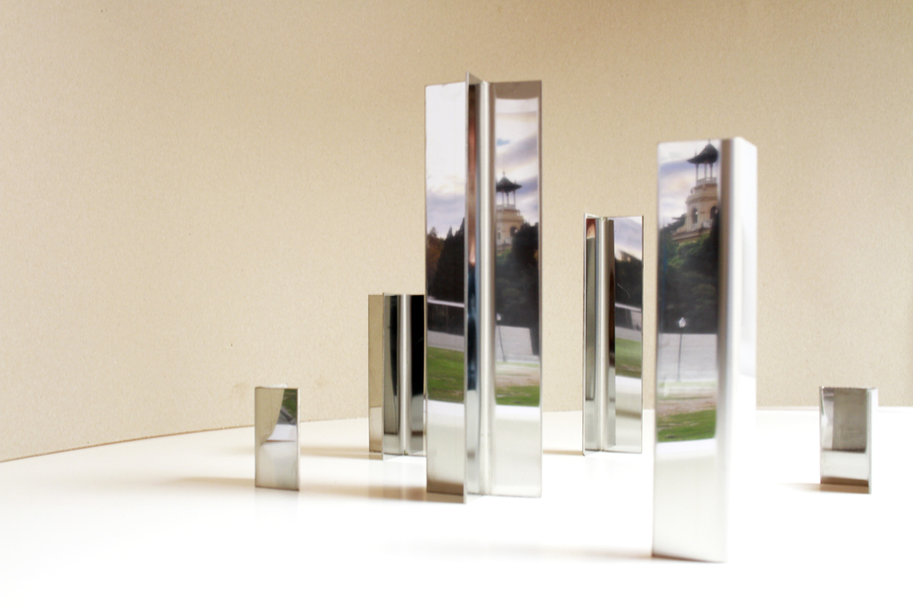 Es una propuesta, a su vez conceptual y que opera dentro de la sintaxis formal del Pabellón de Barcelona; una columna que desarticula a otra columna en su reflejo. Por ello descontextualizamos con un cambio de proporción, uno de los elementos fundamentales de la forma constructiva de Mies, la columna en cruz griega, para hacerla vivir como una instalación escultórica en el exterior. La columna jónica se sugiere con el pilar en cruz, que multiplica los ángulos de reflexión y descompone la visión del conjunto. Las piezas exentas, de acero inoxidable espejo, relacionan interior estructural con exterior, simulando una expansión del pabellón hacia el entorno. Estos elementos esculturales, dispuestos en relación a la circulación del flujo, permitirán múltiples propuestas visuales desde infinitos ángulos.