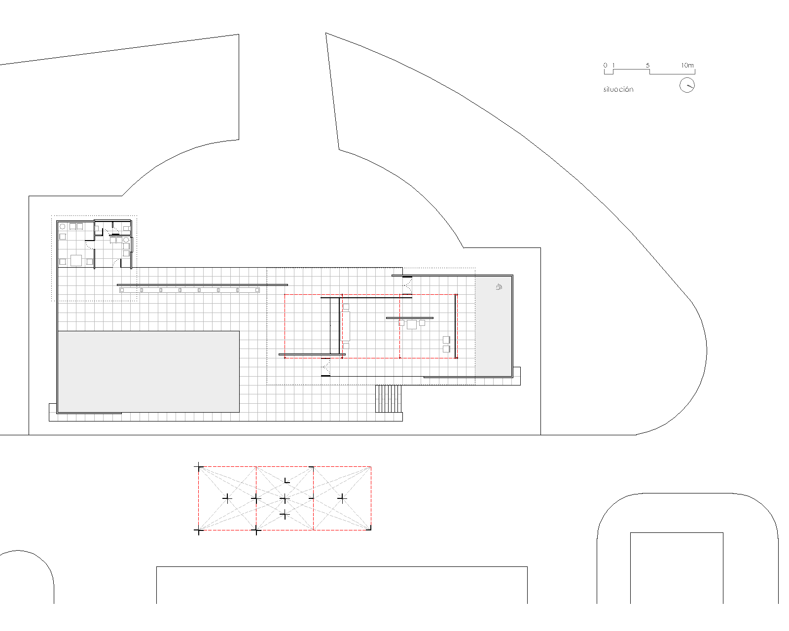 Las relaciones entre forma y estructura de los ocho pilares en cruz del pabellón, nos dan la clave conceptual de la distribución integrando el plano arquitectónico de Mies en la parcela. La puesta en abismo de una columna dentro de la otra, lleva a todo el discurso arquitectónico de Mies van der Rohe a un clímax de intenciones. Desdibujar la materia a través del reflejo, como se borra una sombra proyectada en una imagen fotográfica.