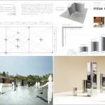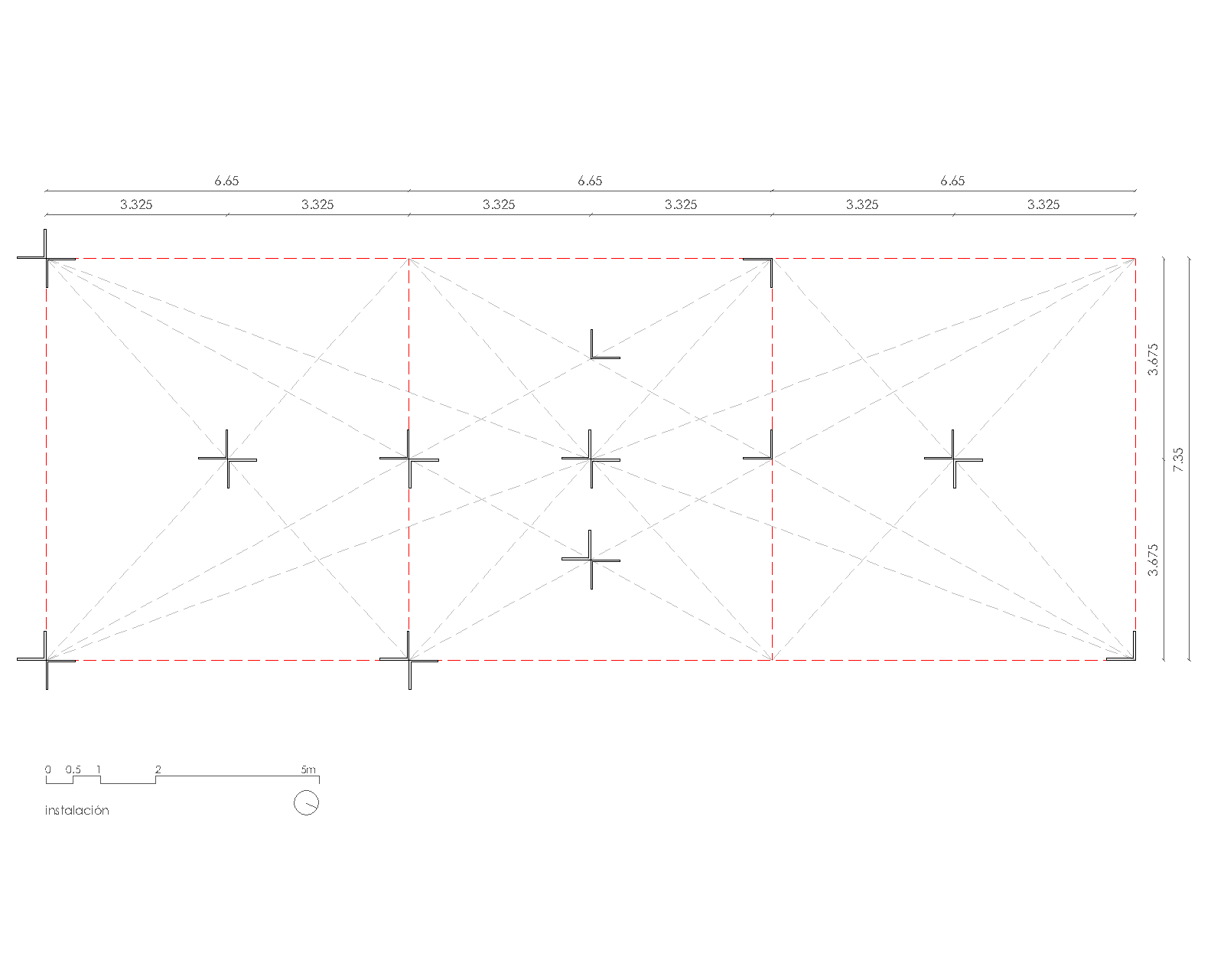Por ello y en relación a la propuesta de concurso ”fear of columns” hemos imaginado en clave de ucronía una instalación que haga referencia al carácter efímero del pabellón, y al de la propia instalación, en su paso por el tiempo. La propuesta se integra dentro del espacio que genera el ritmo de pilares cruciformes del pabellón, colocando las piezas en las intersecciones que surgen de la unión de los vértices en sus mismas proporciones. Así, ocupamos el espacio interior desde sus encuentros y construimos un relato visual cercano a las ruinas de la acrópolis, evocando a su vez la memoria de las antiguas columnas jónicas. Nuestra propuesta se sitúa entre las llamadas «Colonnes de Buren» en Paris y las instalaciones de cristal de Dan Graham, que distribuyen el espacio creando un lugar de experiencia, en una circulación fluida y en permanente transición visual.